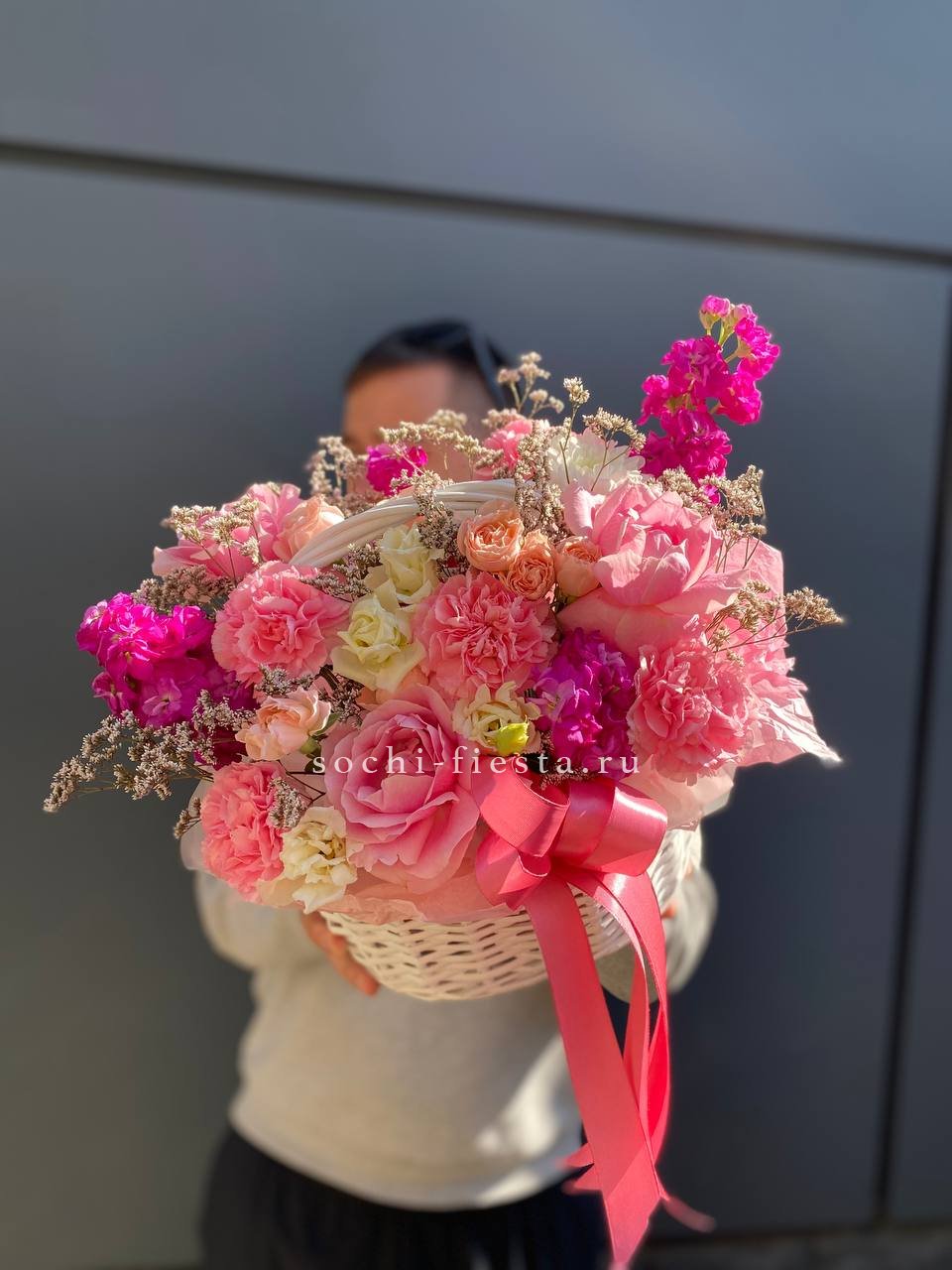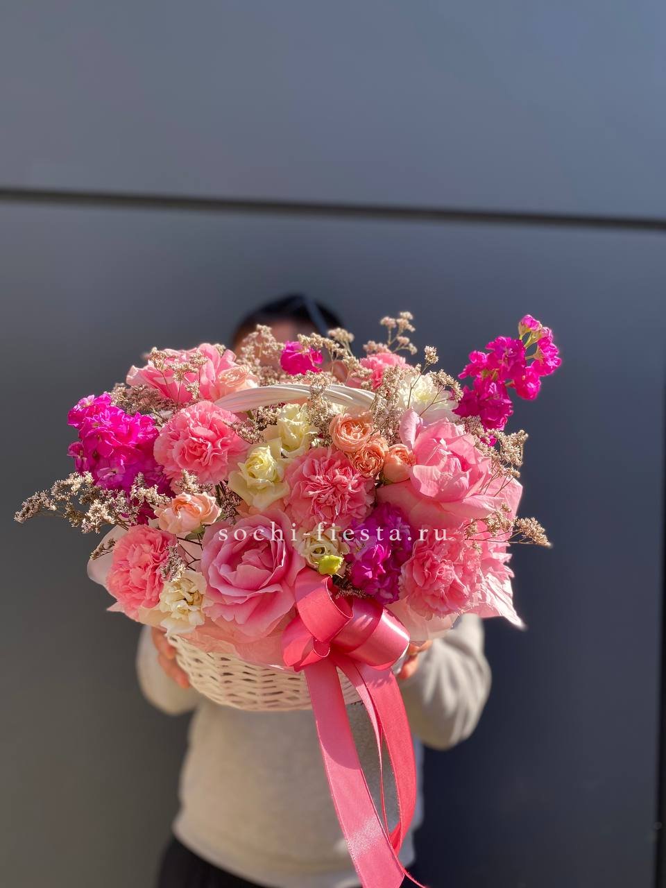 Маттиола и диантусы наполняют корзину летним ароматом. Кустовые розы чередуются с эустомой, создавая мягкий переход оттенков.