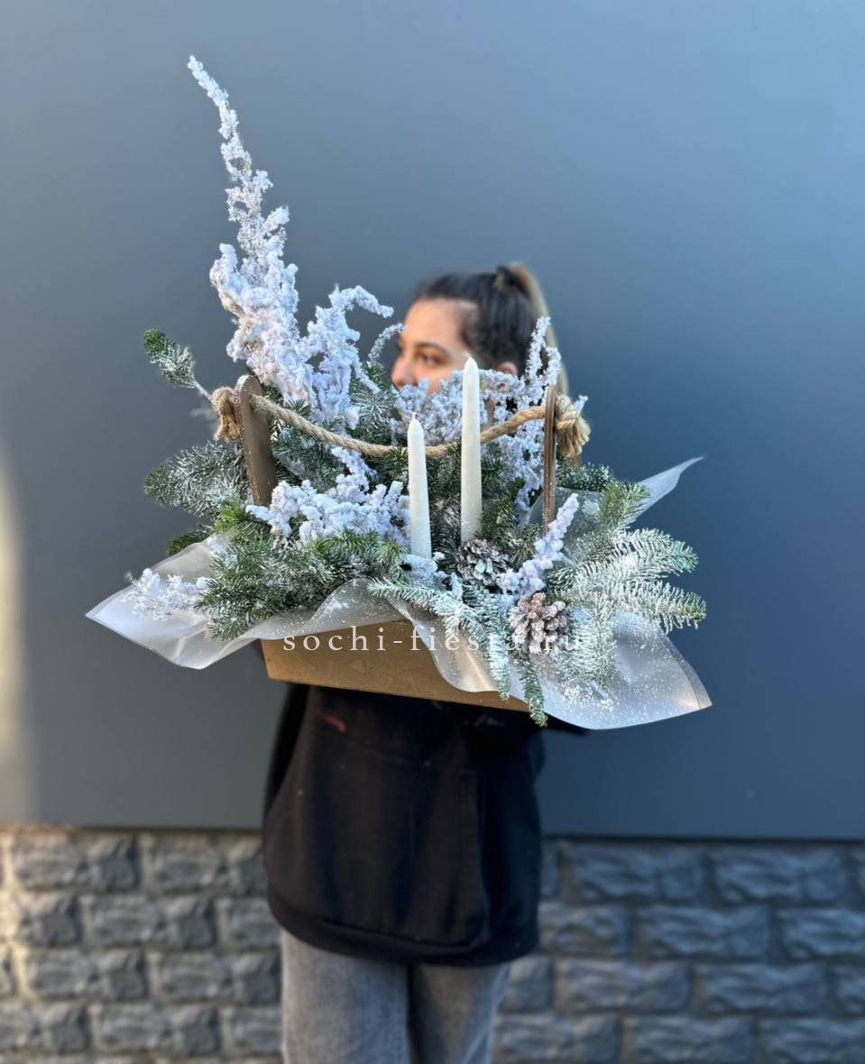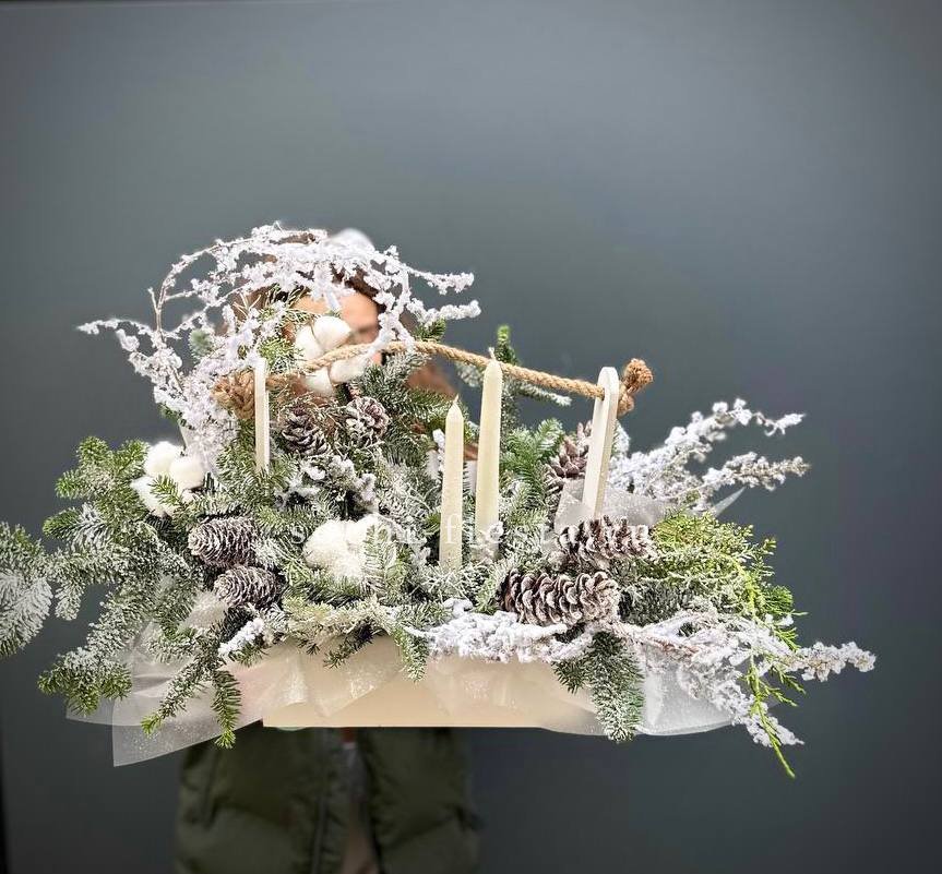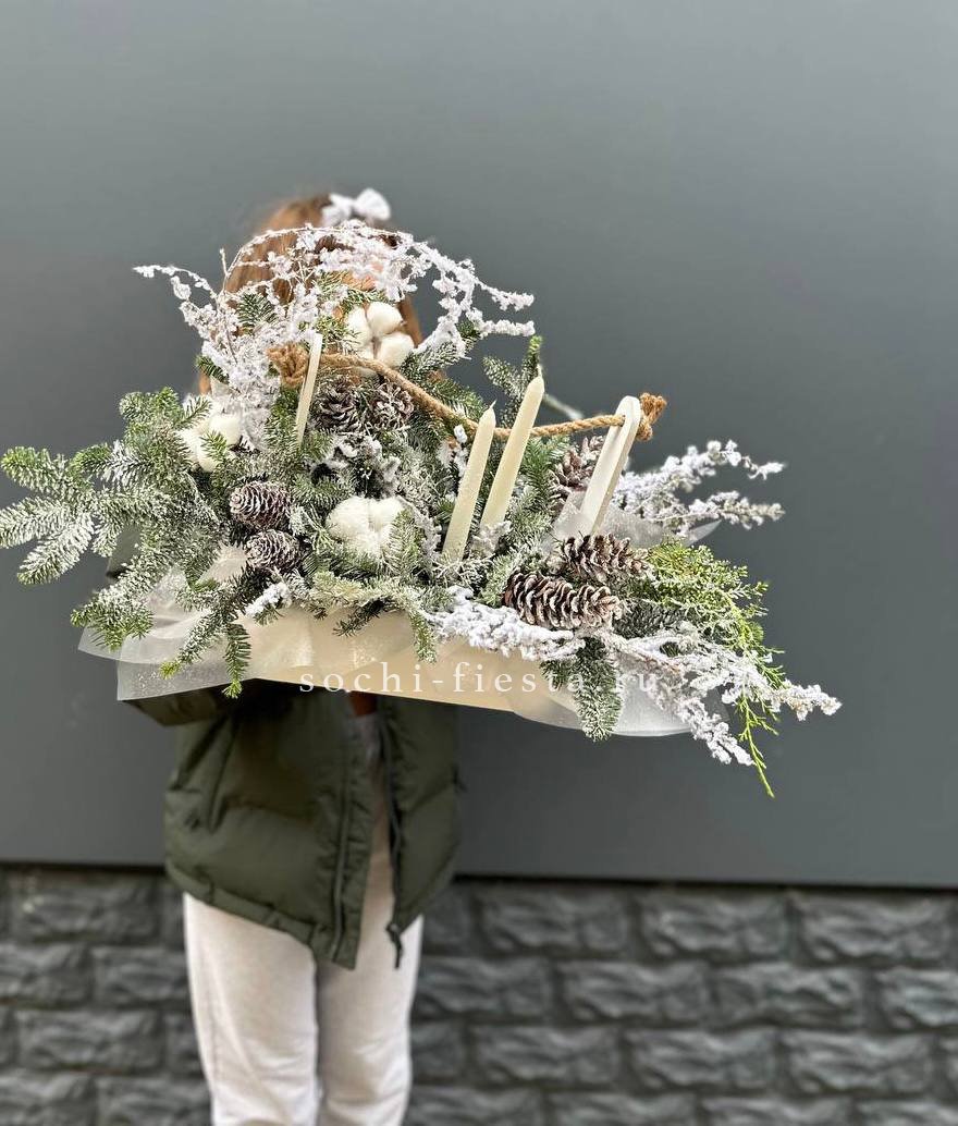 датский нобилис, хлопок, деревянный ящик, шишки, аспарагус (или аналог), свечи Готовая композиция может иметь незначительные внешние отличия от примера на фотографии.