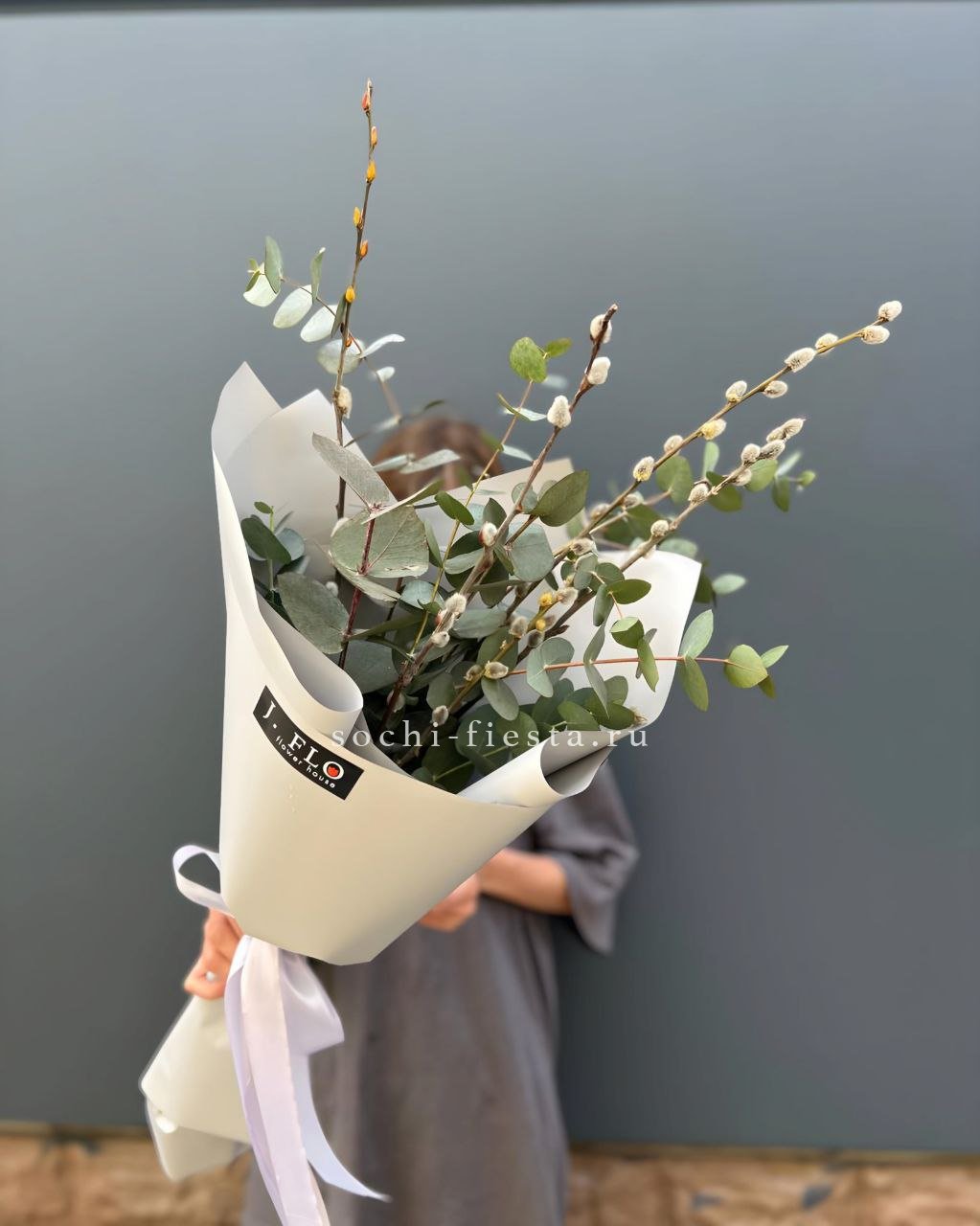 Цветочная композиция идеальна для Православных Праздников! Состав выполнен из белых роз, вербы, маттиолы, лагуруса и керамического кролика!