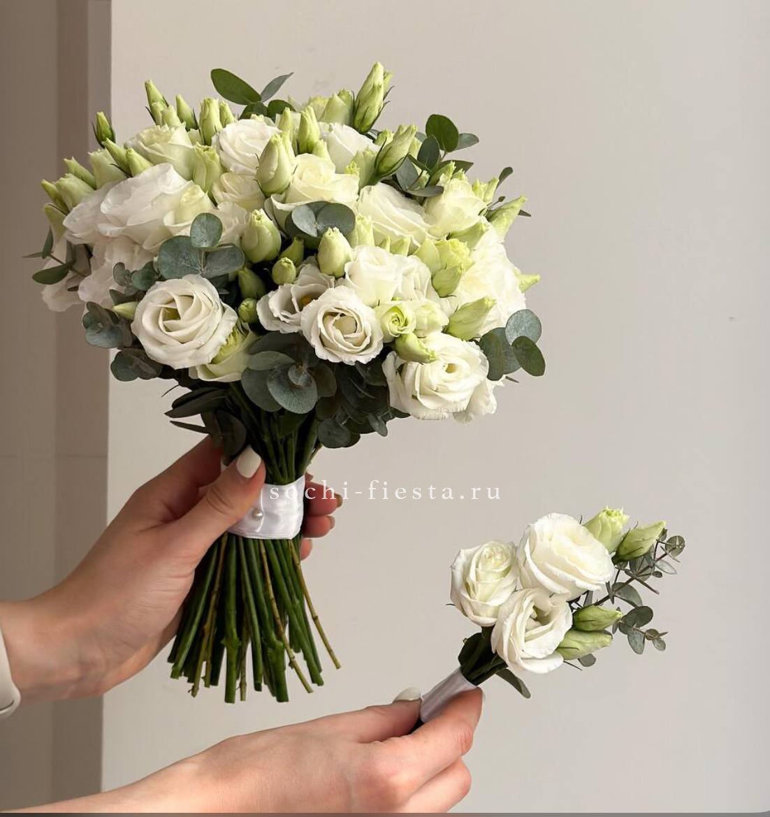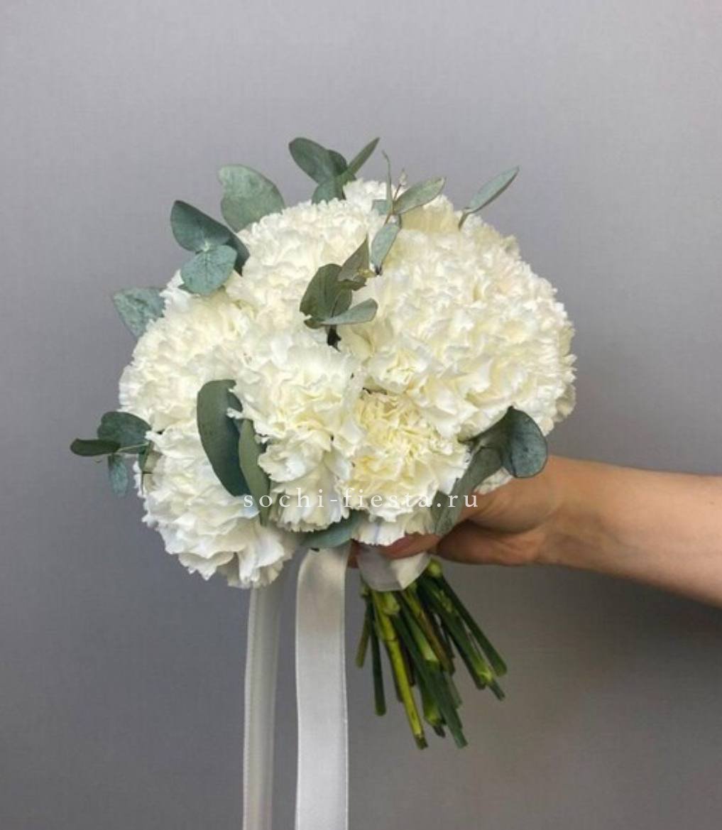 Двадцать один белоснежный диантус собран в округлую форму классического свадебного букета. Плотная структура и чистота линий подходят для церемонии.