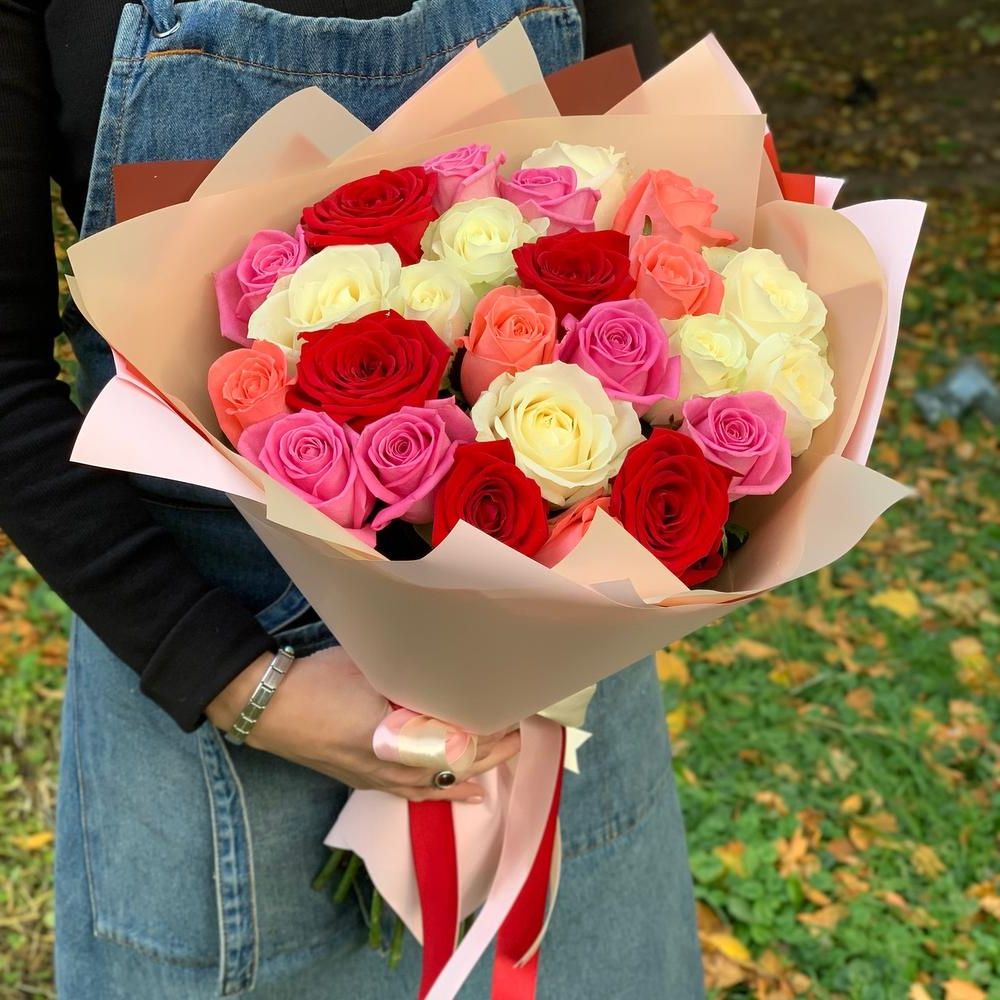 Двадцать пять разноцветных роз Carousel в прозрачной корейской пленке. Яркая палитра от персиковых до малиновых оттенков создает живописное впечатление с первого взгляда.
