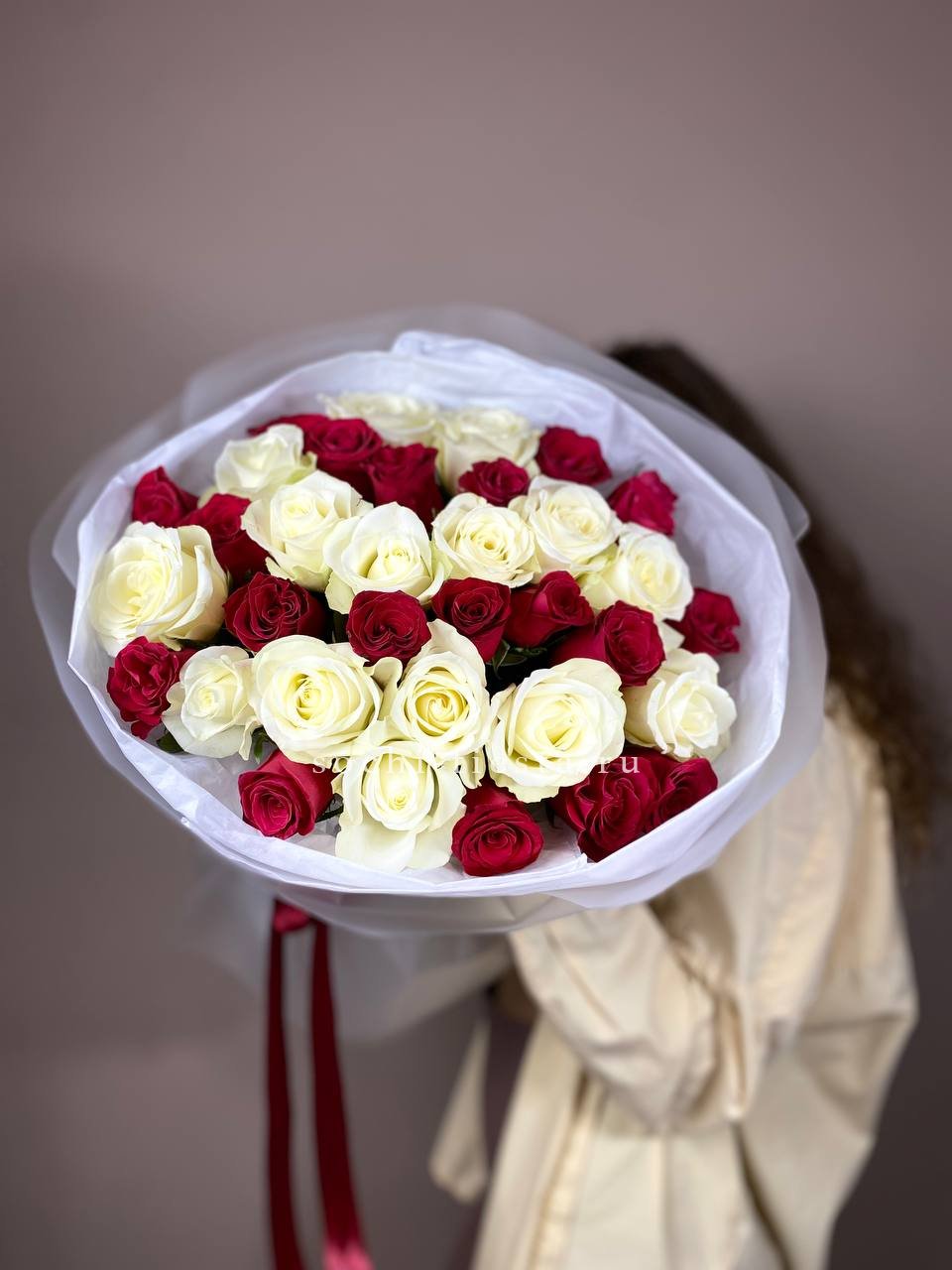 В составе 15 красно-белых роз.