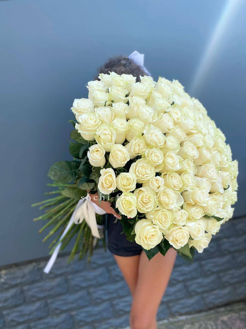 101 белая роза 90см, лента.