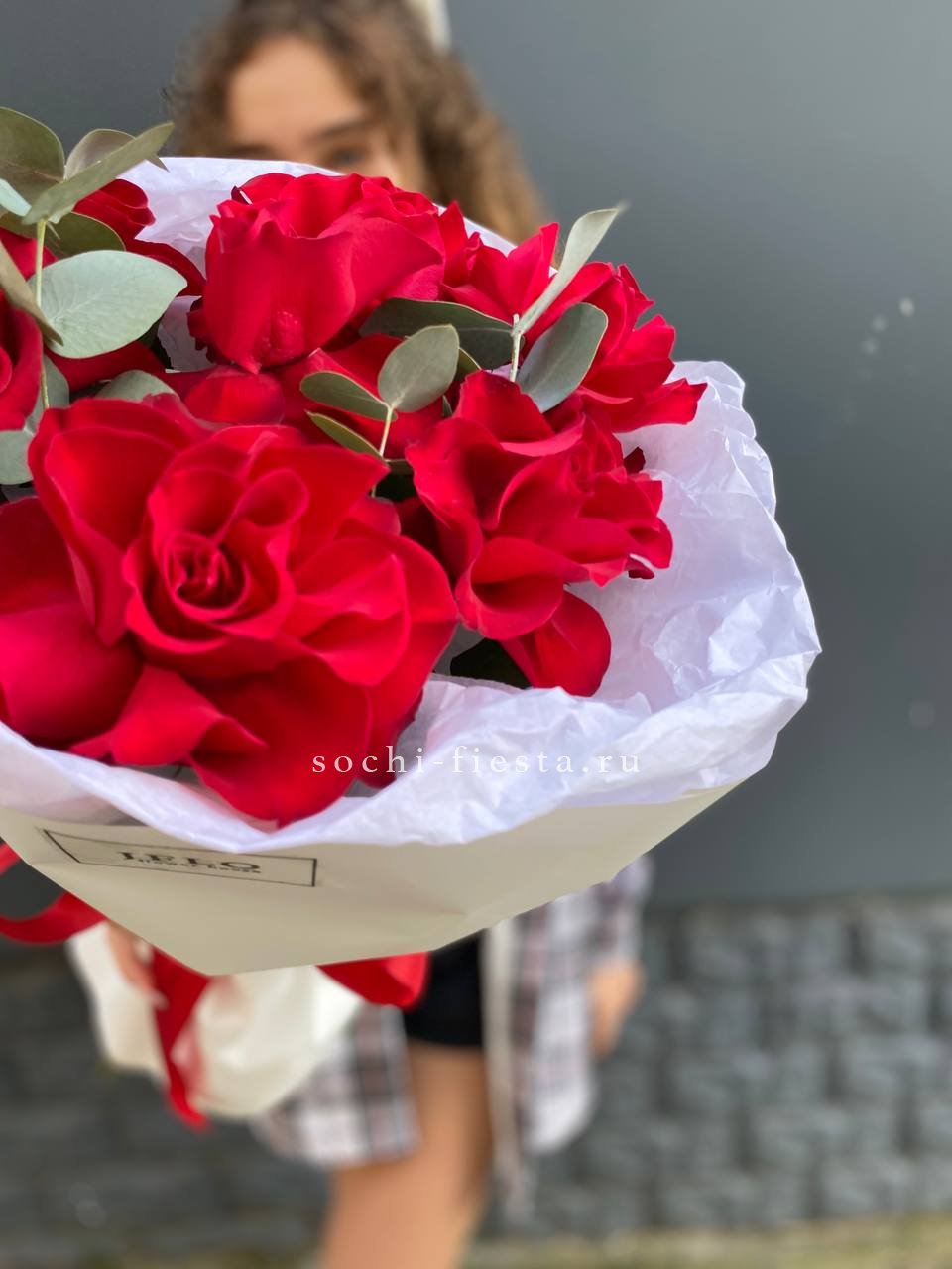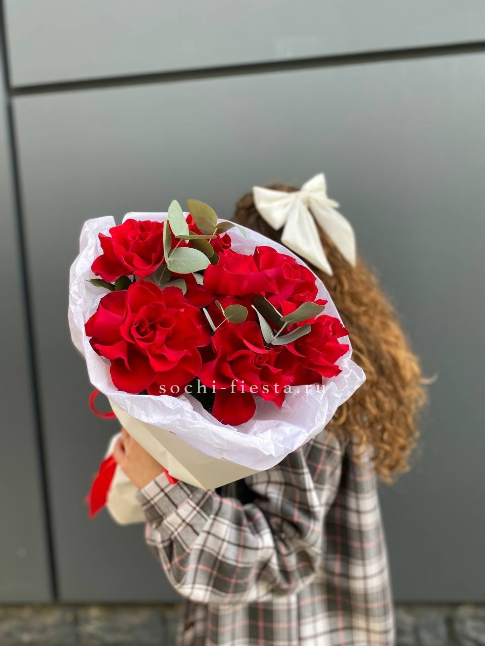 101 красная роза, эвкалипт, лента, оформление.
