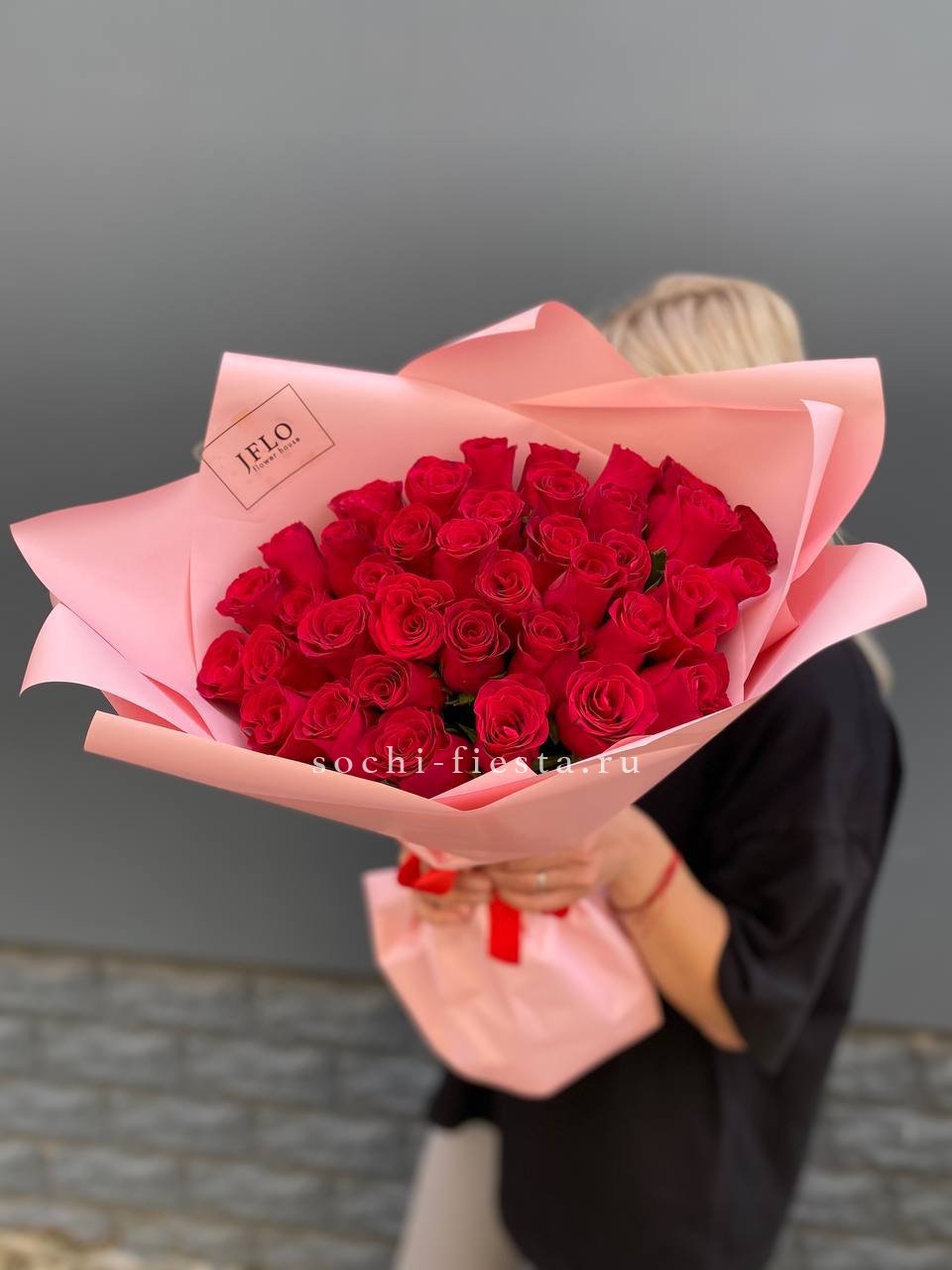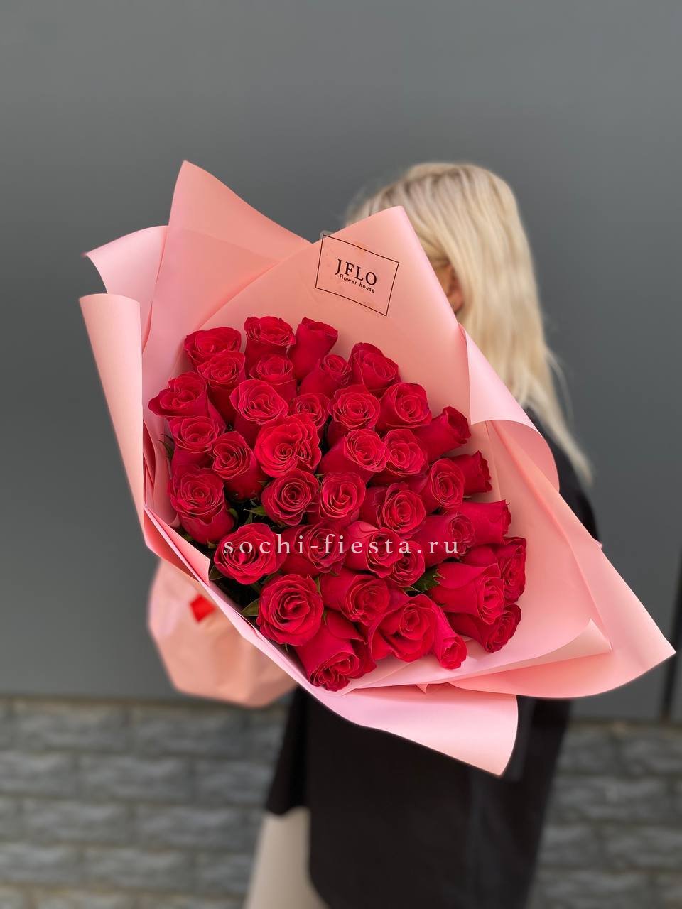Плотная сборка из тридцати семи бутонов создает насыщенное красное пятно. Крафтовая обертка подчеркивает естественную фактуру лепестков. Букет держит форму и выглядит весомо.