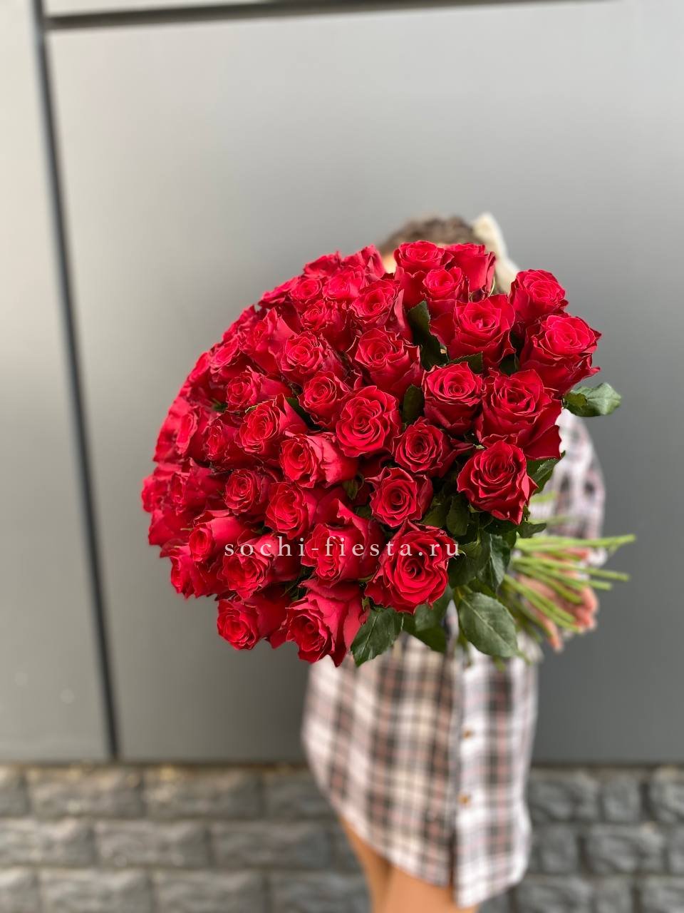 Красный монохром из пятидесяти одной розы притягивает взгляд своей насыщенностью. Крупная композиция заполняет пространство и создает яркое визуальное впечатление.