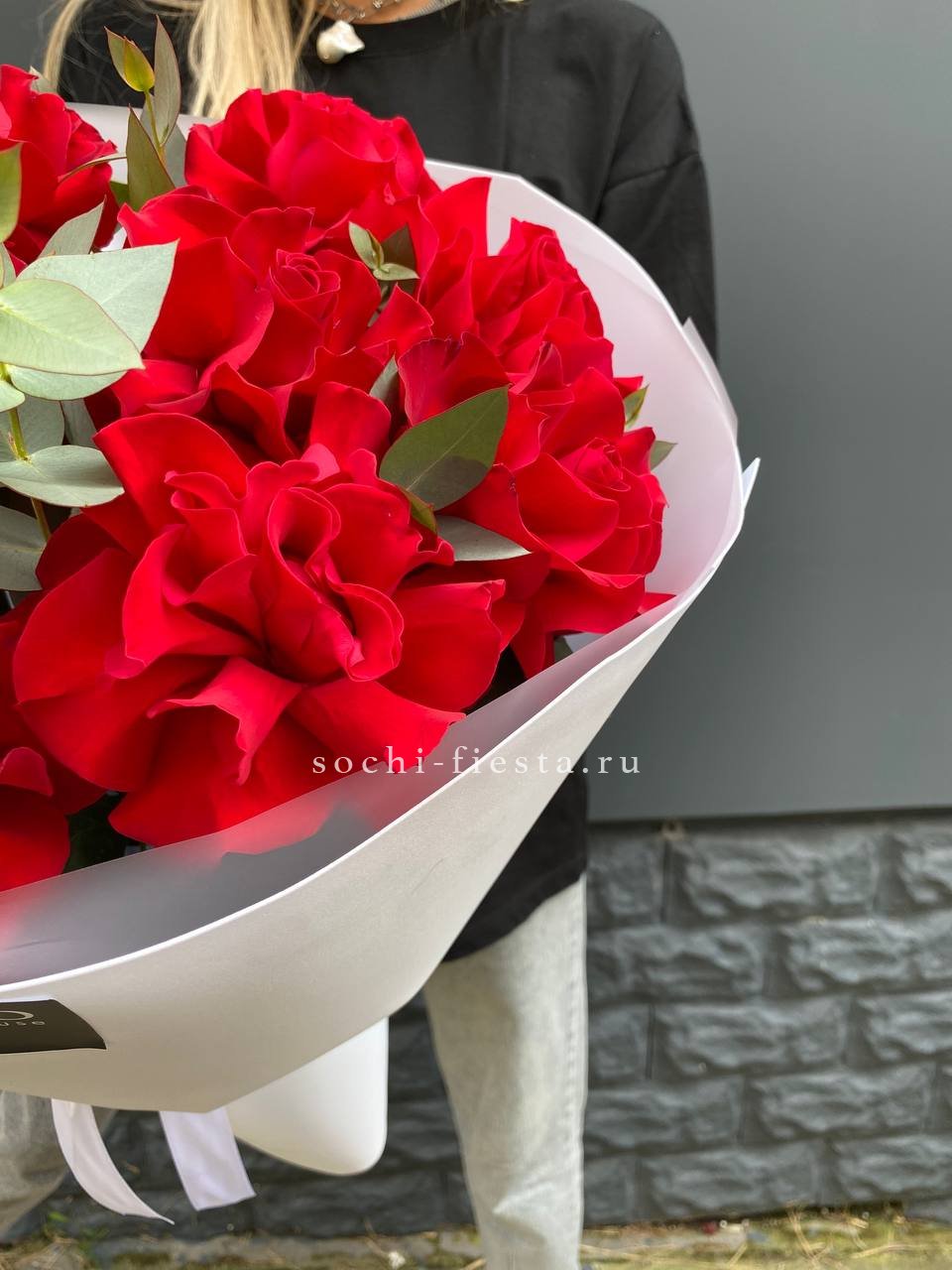 Французские розы с вывернутыми лепестками образуют пышную фактуру и глубину. Эвкалипт оттеняет насыщенность красного и придаёт букету свежесть.