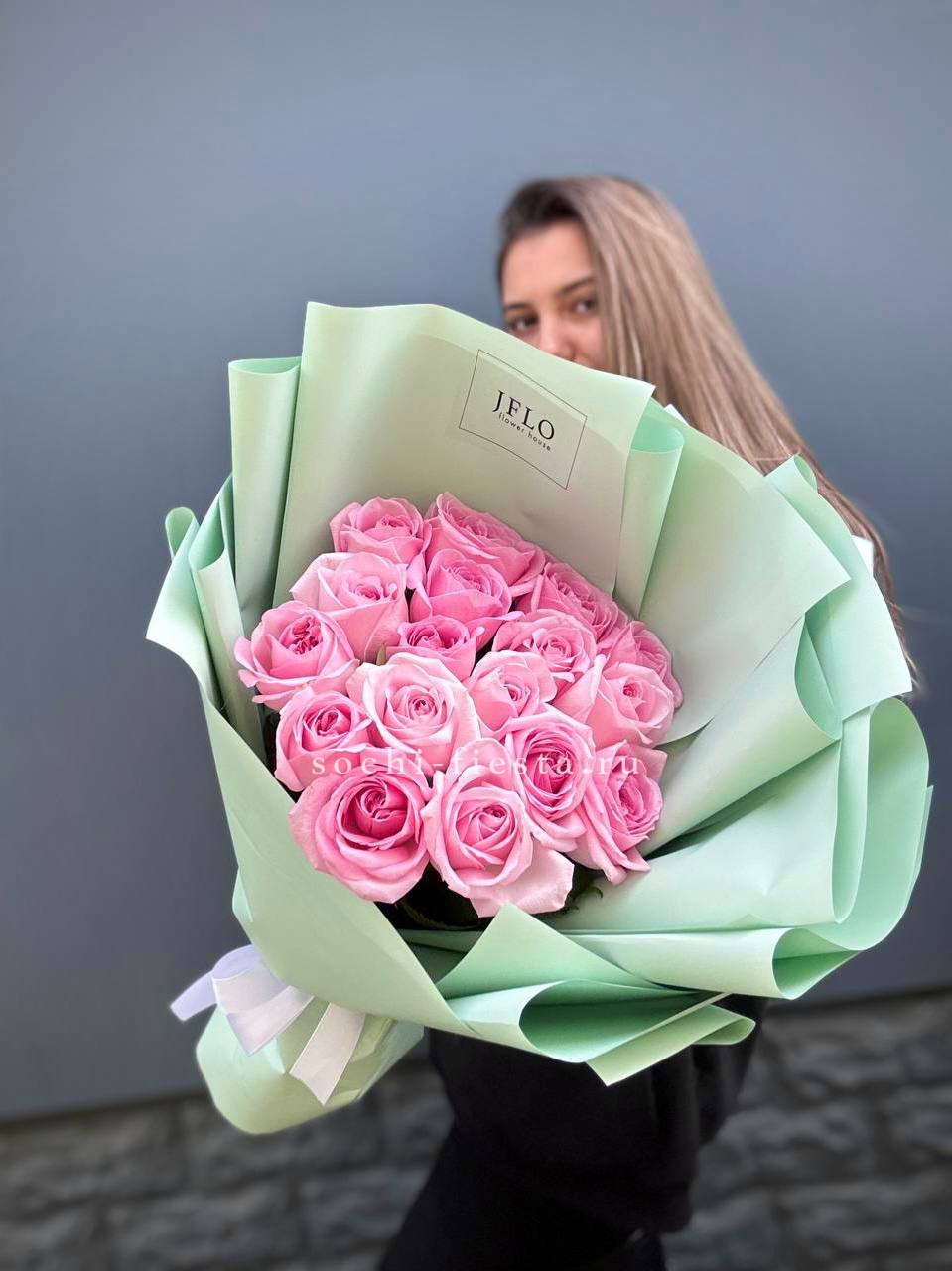 17 розовых роз, лента, крафт или пленка.