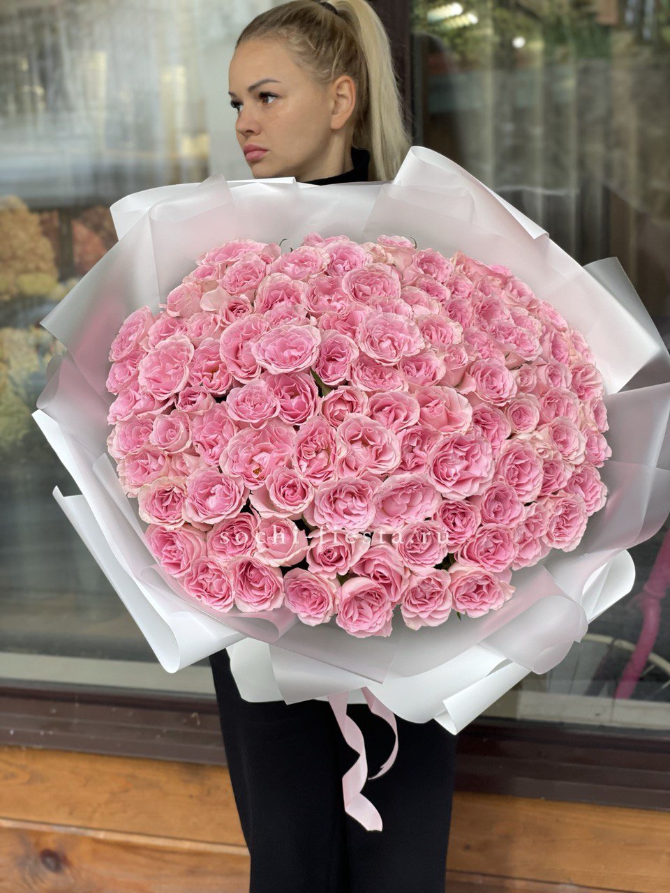 розовые пионовидные розы под ленту.