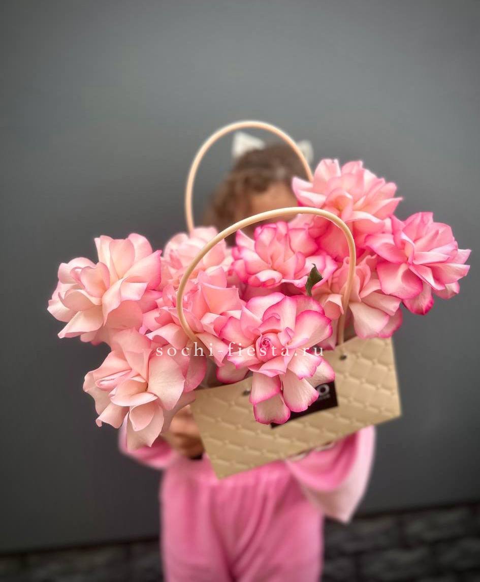 Вывернутые розы открывают всю глубину бутона и создают объёмную фактуру. Каждый лепесток развернут наружу, обнажая сердцевину. Розовый оттенок звучит свежо и современно.