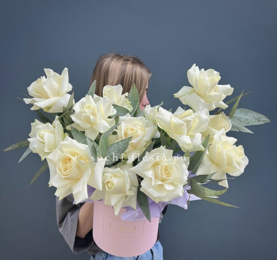 Французские розы собраны в плотную округлую форму, где каждый бутон раскрывается слоями. Веточка эвкалипта добавляет графичности общей композиции. Букет из одиннадцати роз держит форму и выглядит завершенно в авторской упаковке.