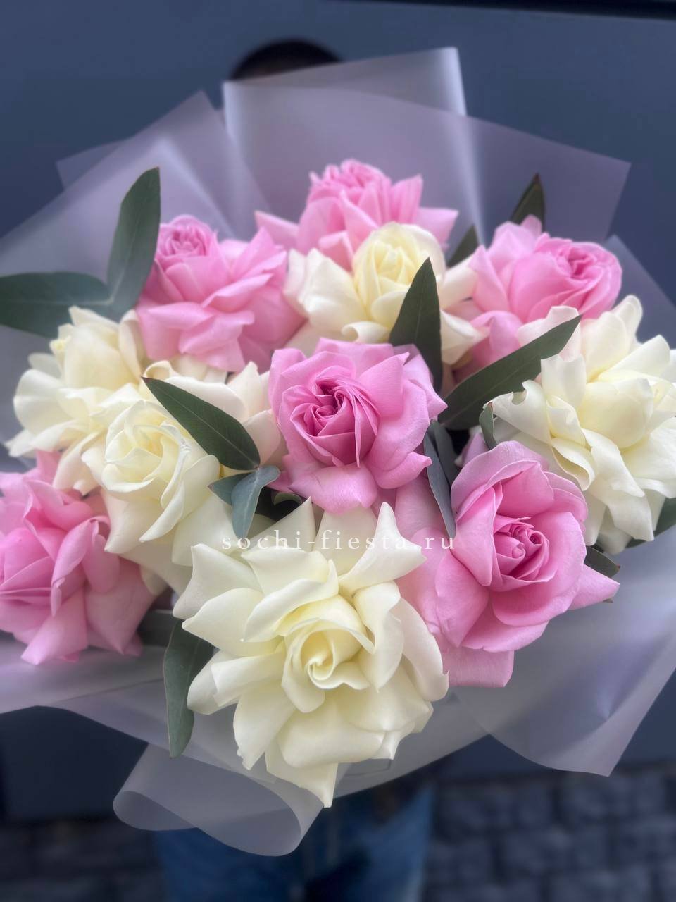 французские розы - 11 шт., эвкалипт-1шт, лента, авторская упаковка.
