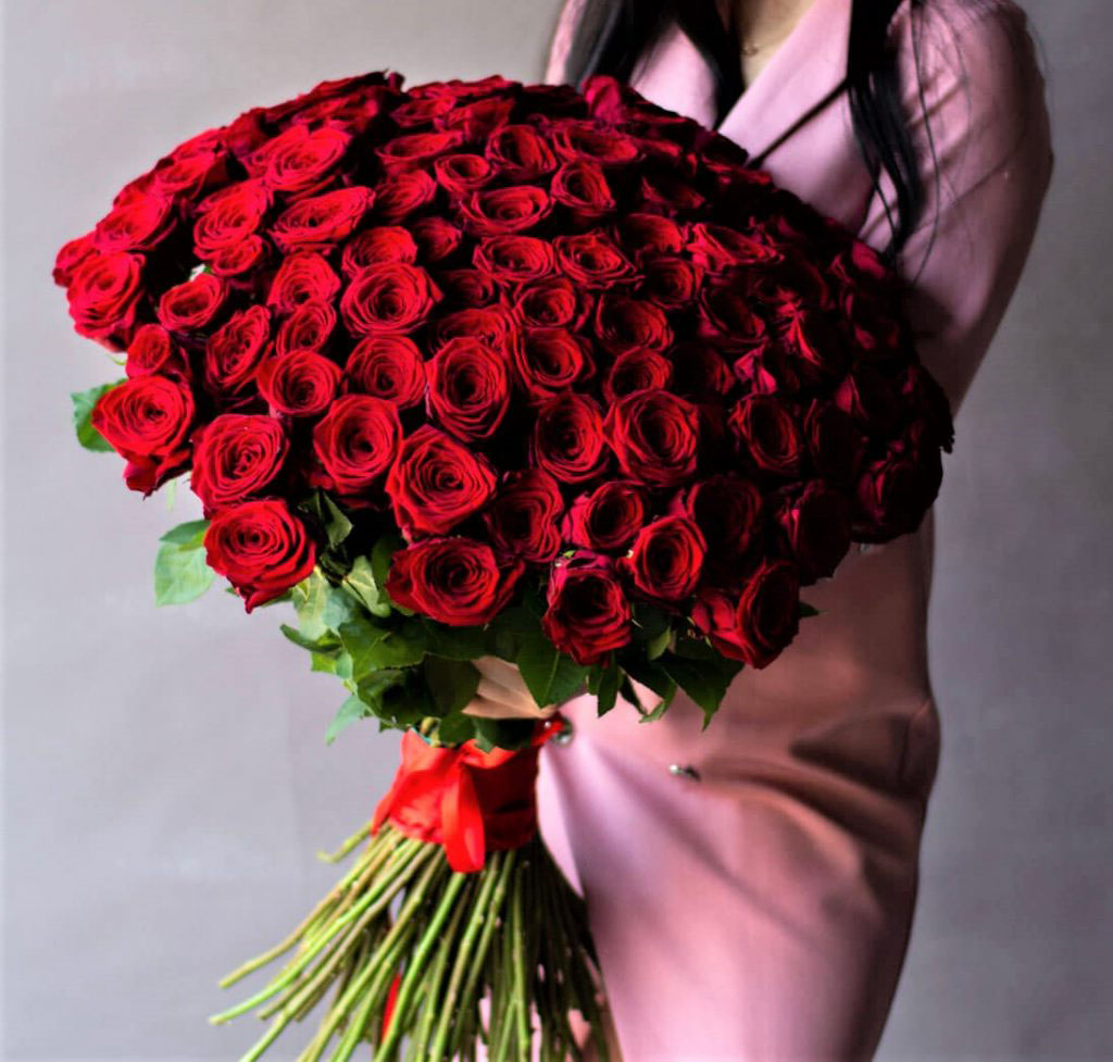 Плотная сборка из ста одной розы образует густую шапку бутонов глубокого красного цвета. Каждый цветок раскрывается постепенно, создавая живую фактуру и визуальную глубину композиции.