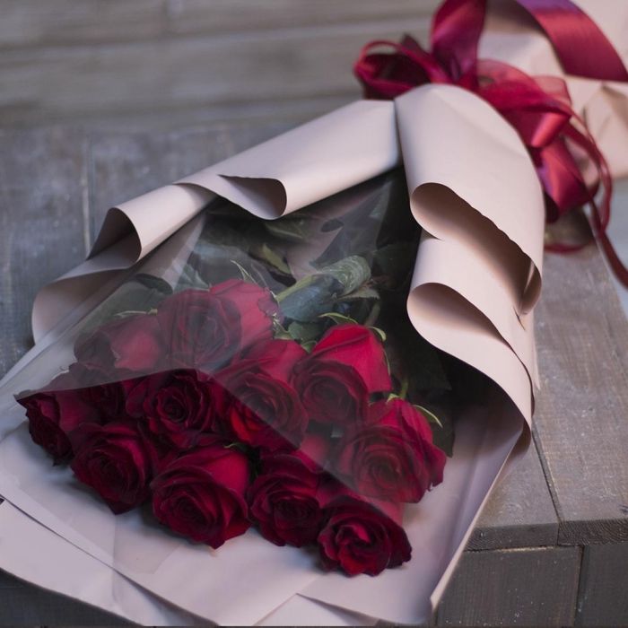 Одиннадцать голландских роз с бархатными красными лепестками уложены в плёнку с лентой. Классическая подача и выразительный цвет создают запоминающееся впечатление.