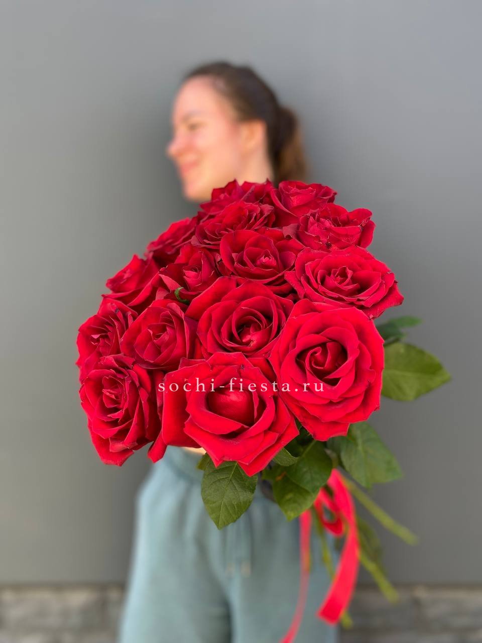 Двадцать пять стеблей выстроены в объёмную композицию с выразительным присутствием. Авторское оформление добавляет завершённость и подчёркивает масштаб букета.