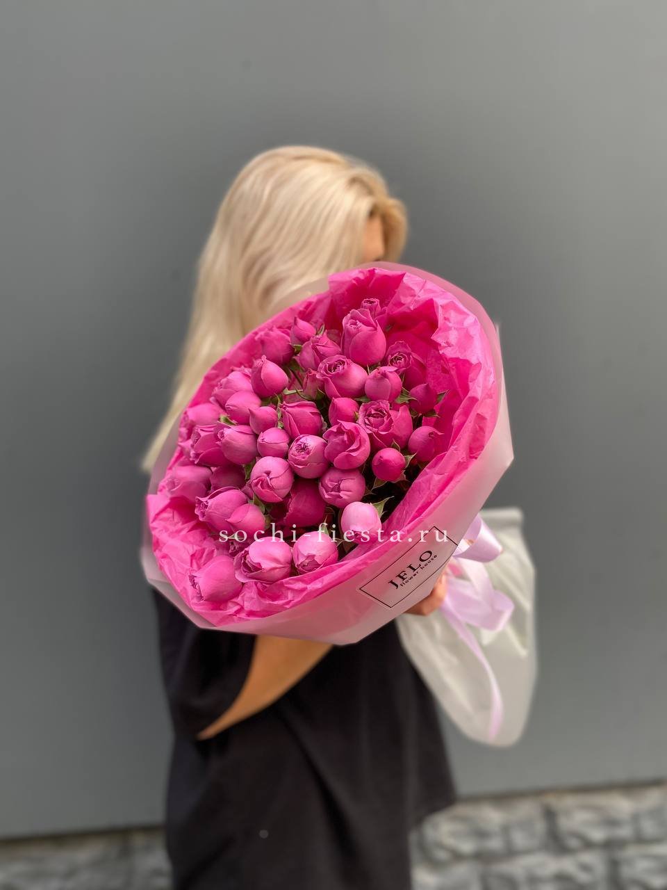55 роз сорта Misty bubbles и bombastic, лента, дизайнерская упаковка.
