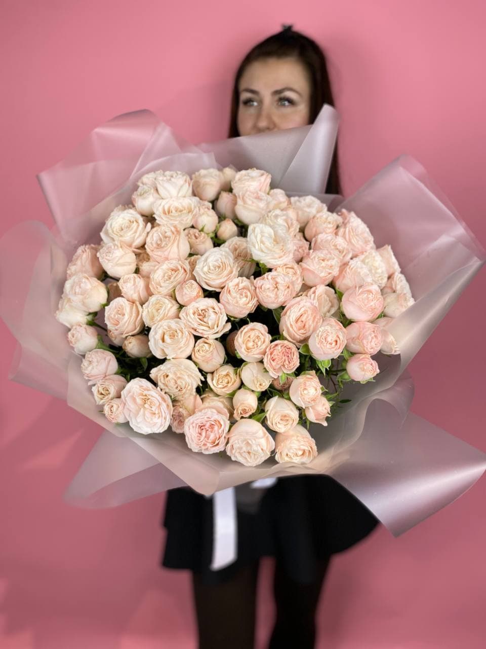 Тридцать пять пионовидных кустовых роз формируют объёмную композицию с густой текстурой. Плотно уложенные бутоны создают впечатление цветочного облака в дизайнерской упаковке.