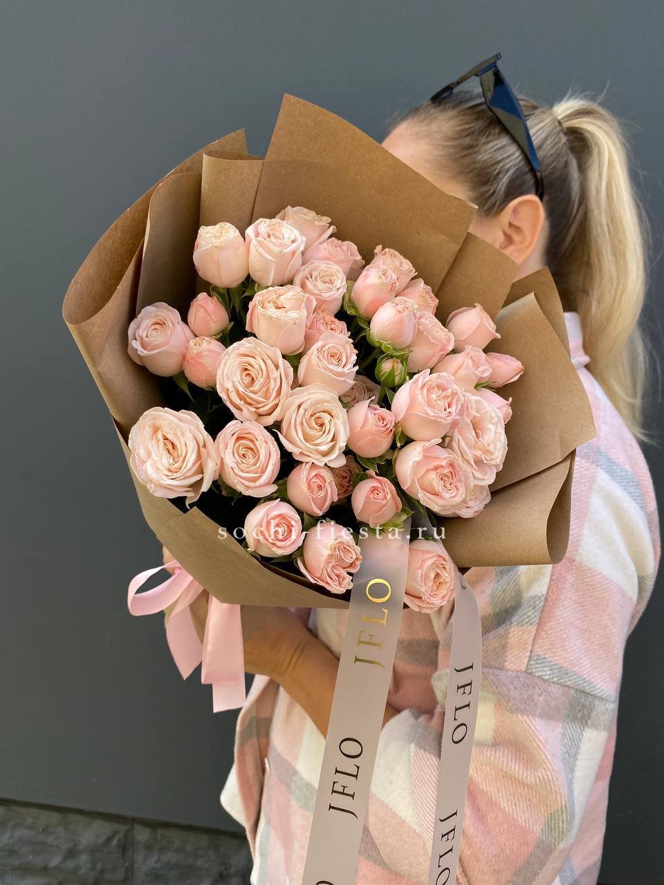 кустовая роза - 19 шт., эвкалипт, лента, дизайнерская упаковка.