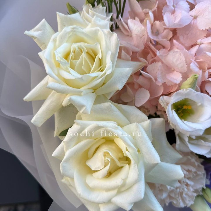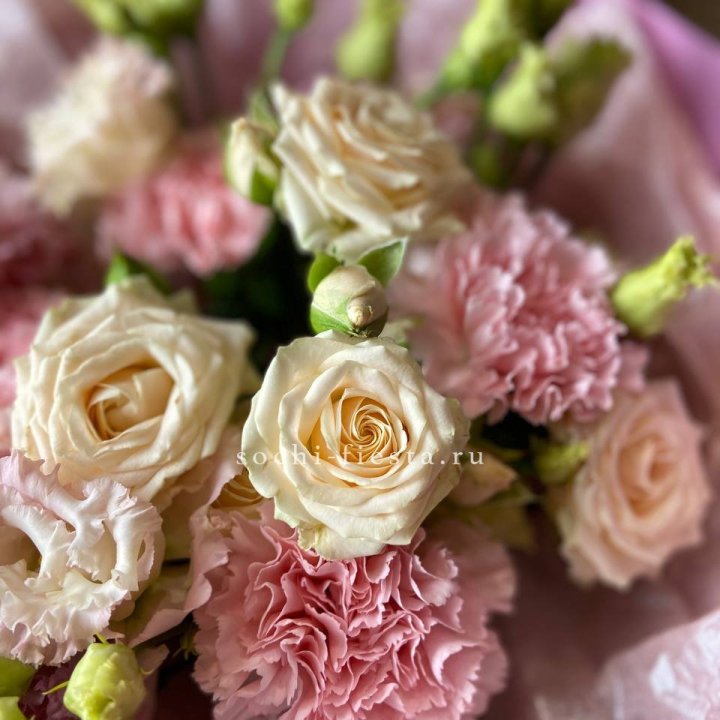 Основа сборных букетов в Кургане: розы (Freedom, Mondial, Avalanche), хризантема кустовая, альстромерия, эустома, фрезия, вероника. Дополнительно — ранункулюсы в сезон, хризантема одиночная, ирис весной, тюльпаны в апреле. Состав зависит от текущей поставки и сезона. Флорист всегда предлагает то, что в лучшей форме прямо сейчас.