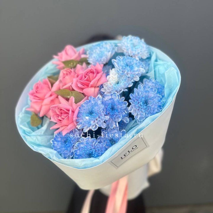 - День рождения — объёмный букет, розы с хризантемой и фрезией.