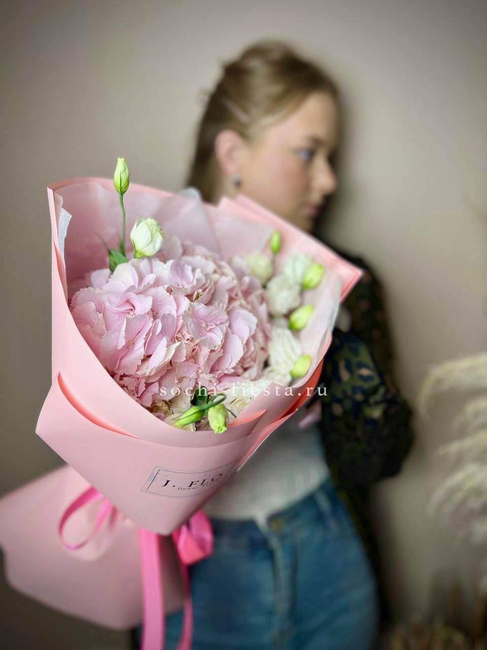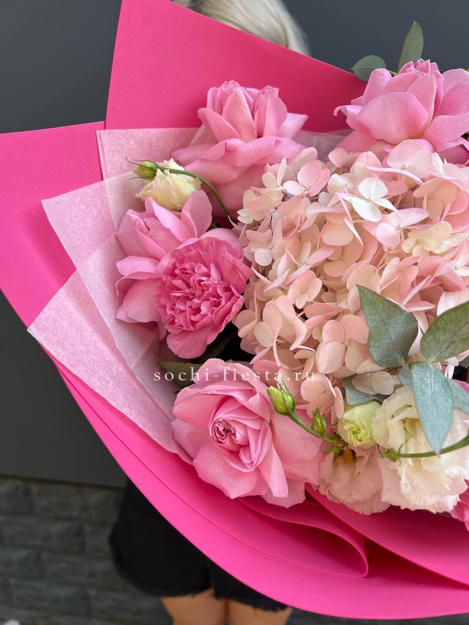 гортензия, розовые розы, диантусы, эустома, маттиолы, эвкалипт лента и дизайнерская пленка.