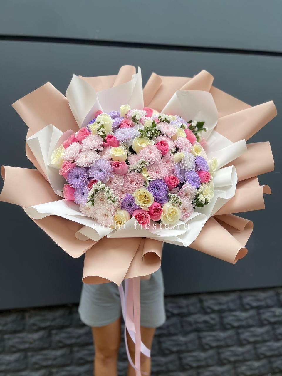 Авторская работа с плотным наполнением и выразительной палитрой. Розы и хризантемы образуют многослойную структуру, где каждый бутон раскрывается в своём ритме.