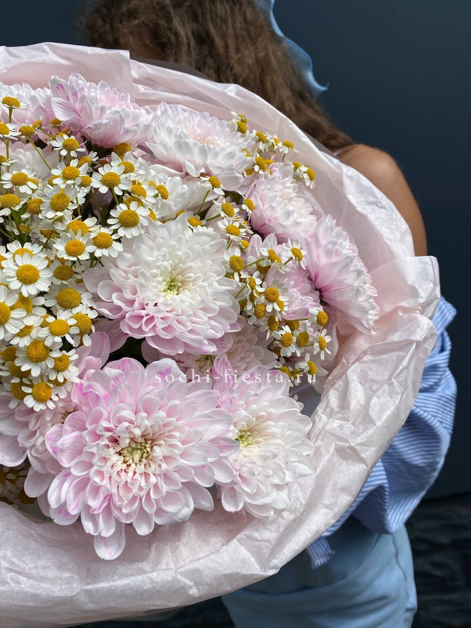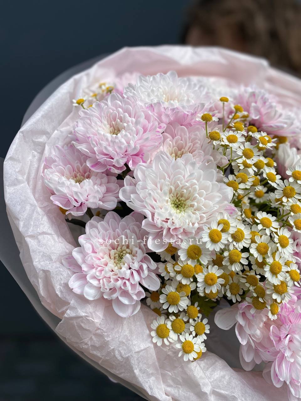 ромашки, кустовые хризантемы, лента и дизайнерская пленка.