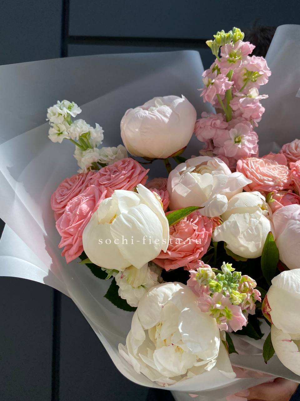 пионы, роза пионовидная, маттиола, лента, дизайнерская пленка.