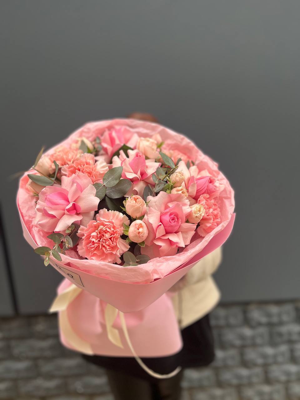 диантусы, эустома, лента, упаковка.
