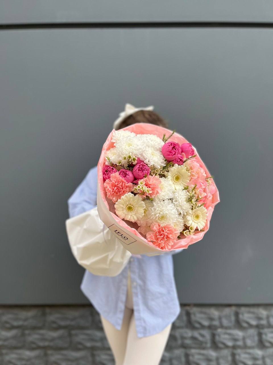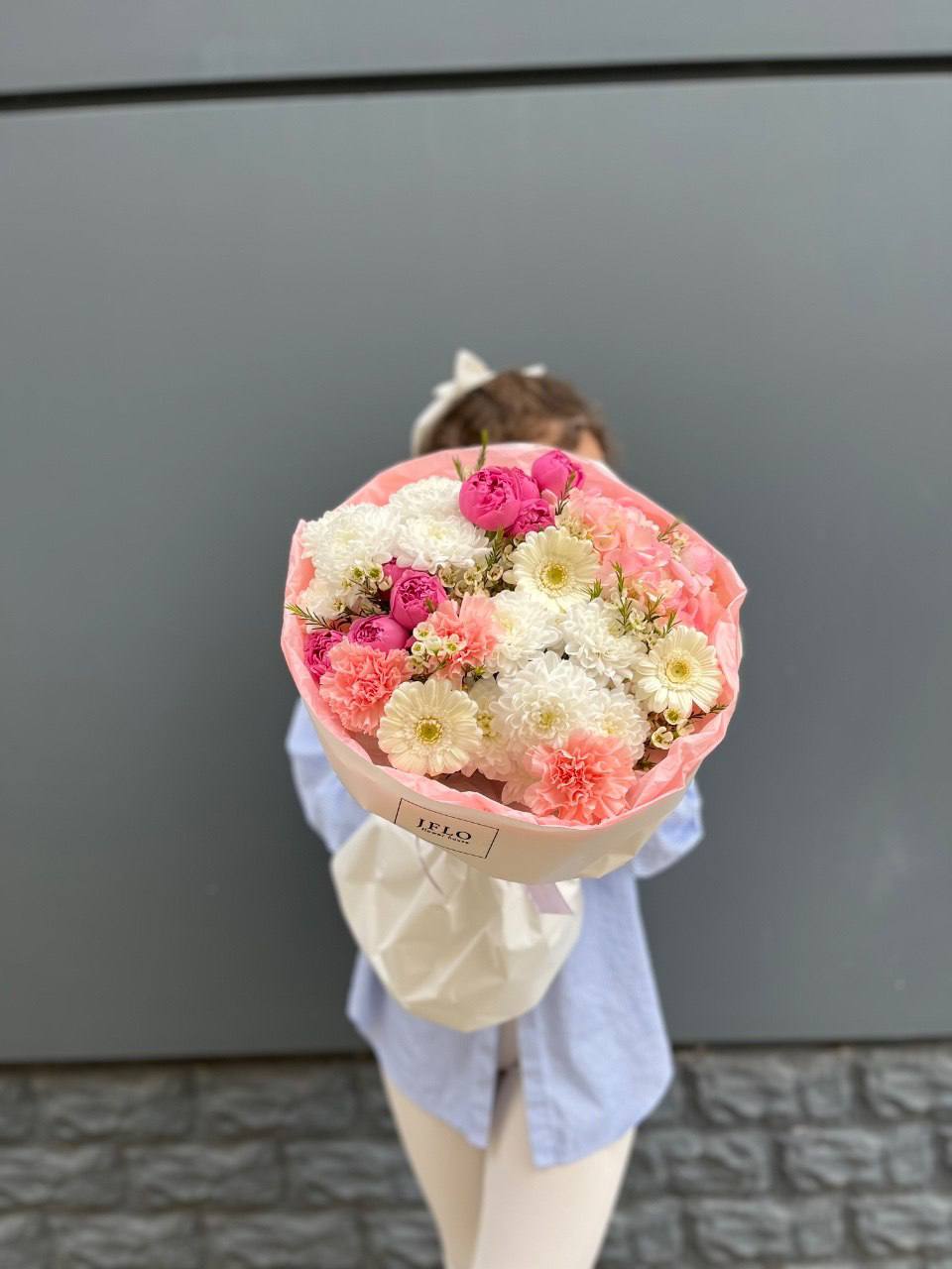Воздушные соцветия эустомы переплетаются с яркими головками диантусов, создавая живую графику в обёртке. Каждый бутон раскрывается по-своему, добавляя композиции объём и движение. Букет для тех, кто ценит свежесть без лишних деталей.