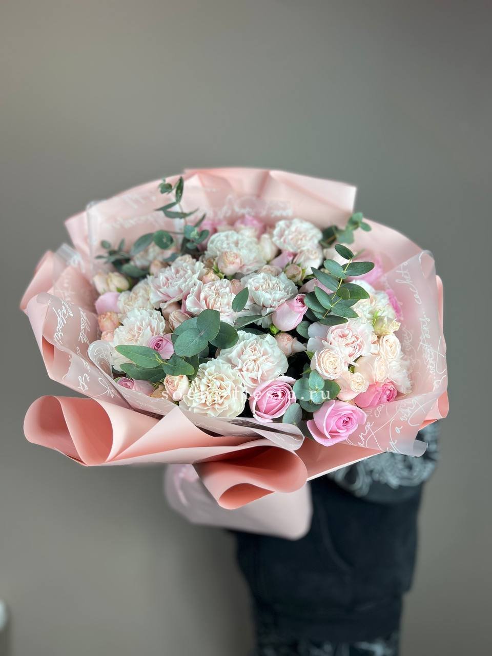 Французские розы и кустовые хризантемы собраны в букет с плотной текстурой и мягким переходом оттенков. Композиция держит форму и долго сохраняет свежесть.