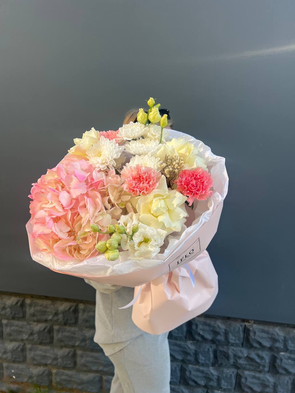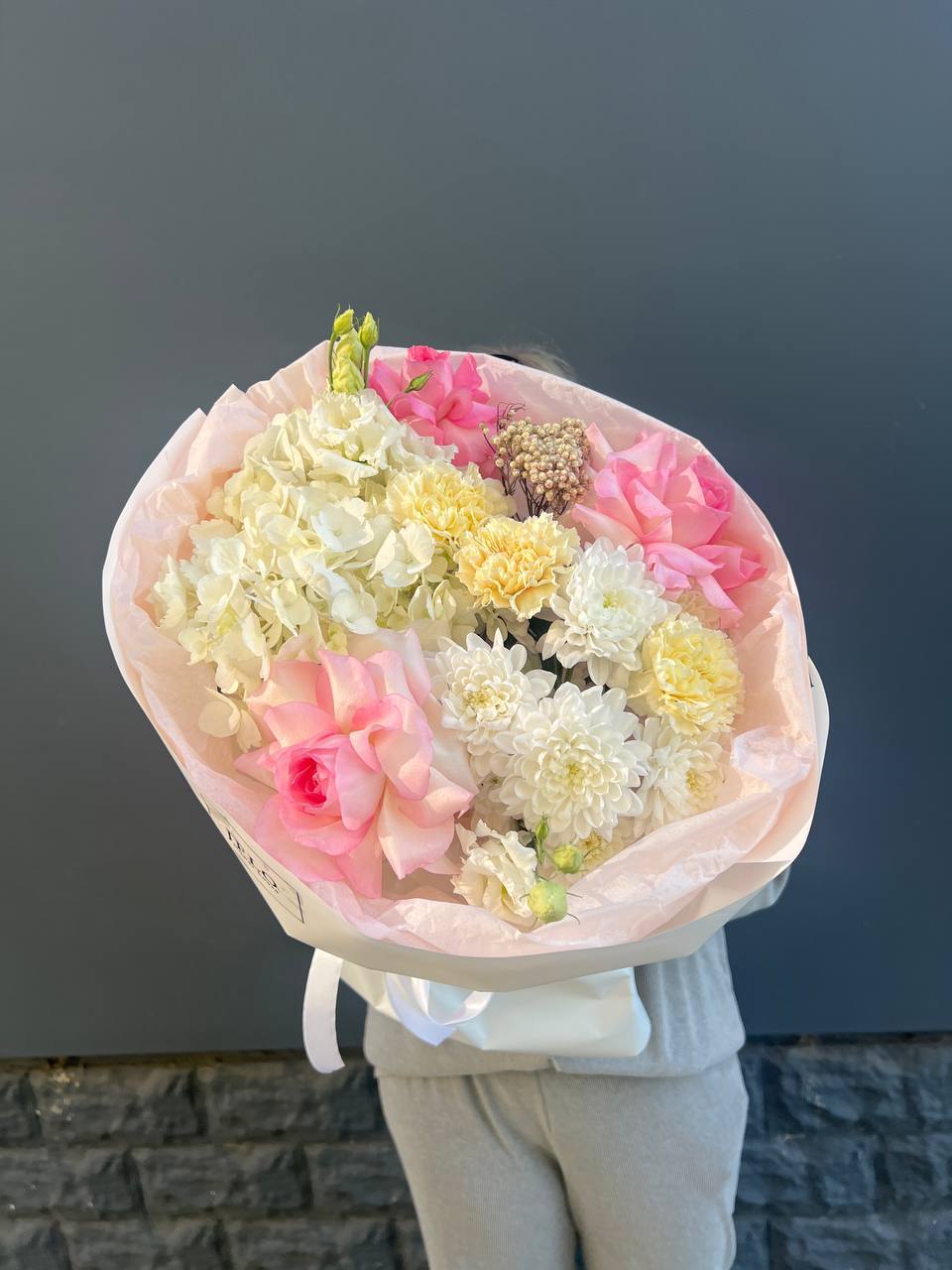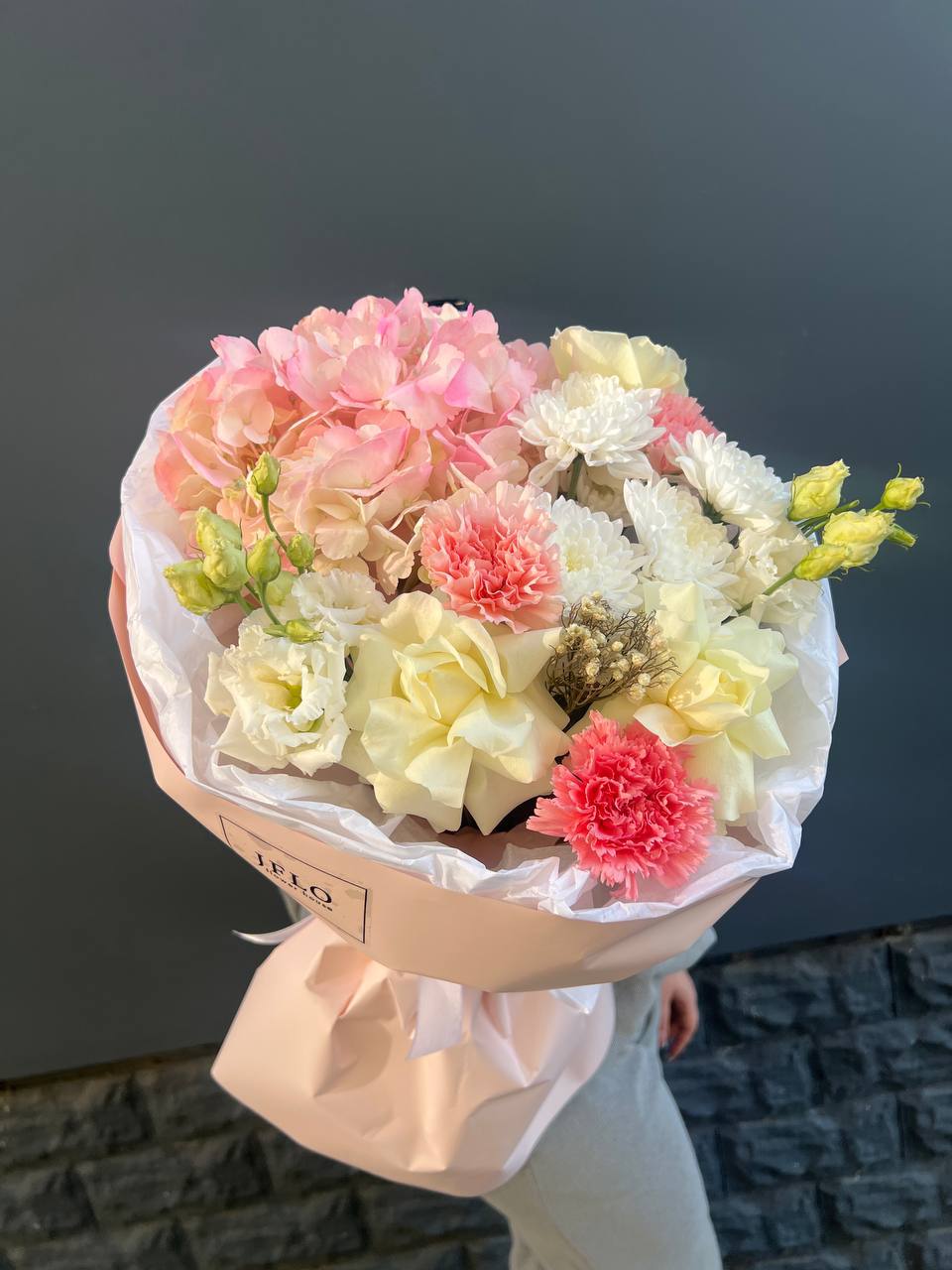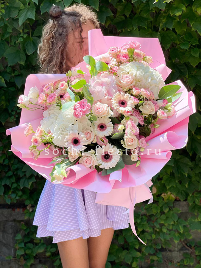 гортензия, диантус, хризантема, эустома, розы, озатамус, пленка.