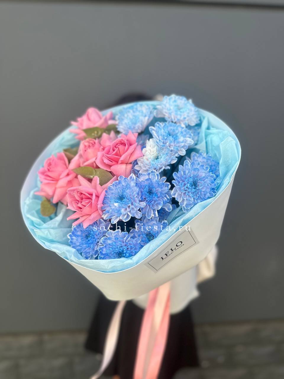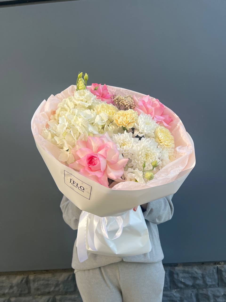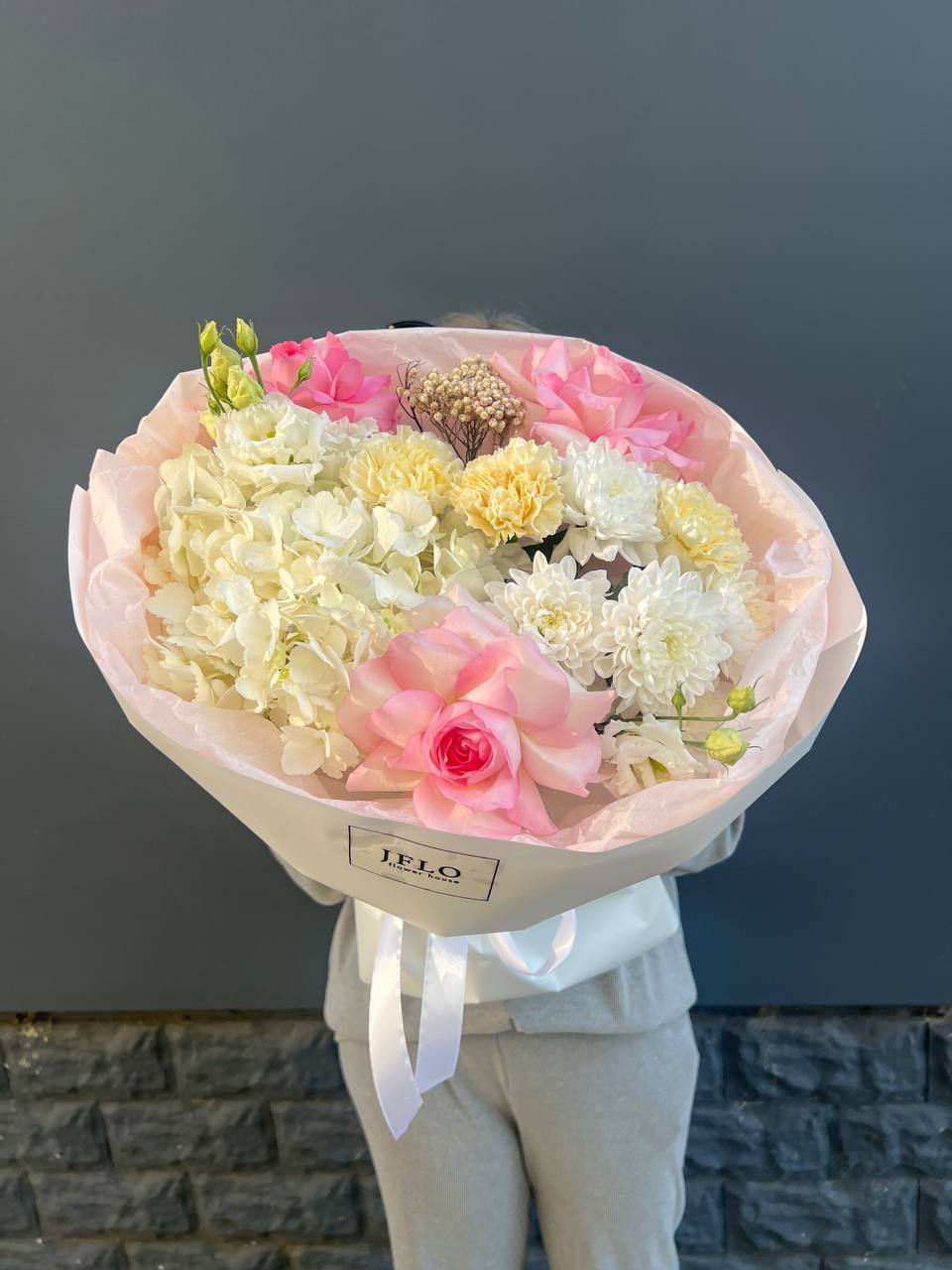 гортензия, диантус, хризантема, эустома, розы, озатамус, пленка.