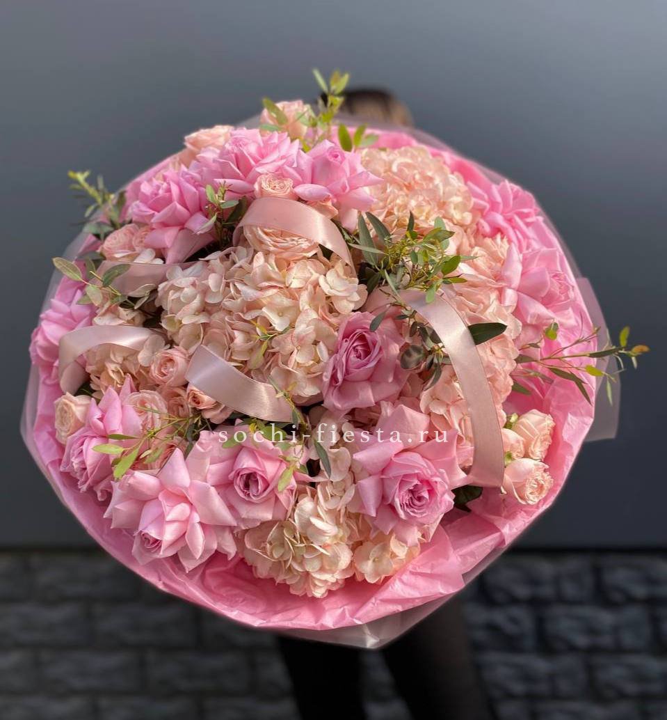 Воздушная композиция с крупными соцветиями гортензии и пышными розами создает ощущение легкости и объема. Эвкалипт добавляет свежести, а бомбастик расставляет яркие акценты между бутонами.