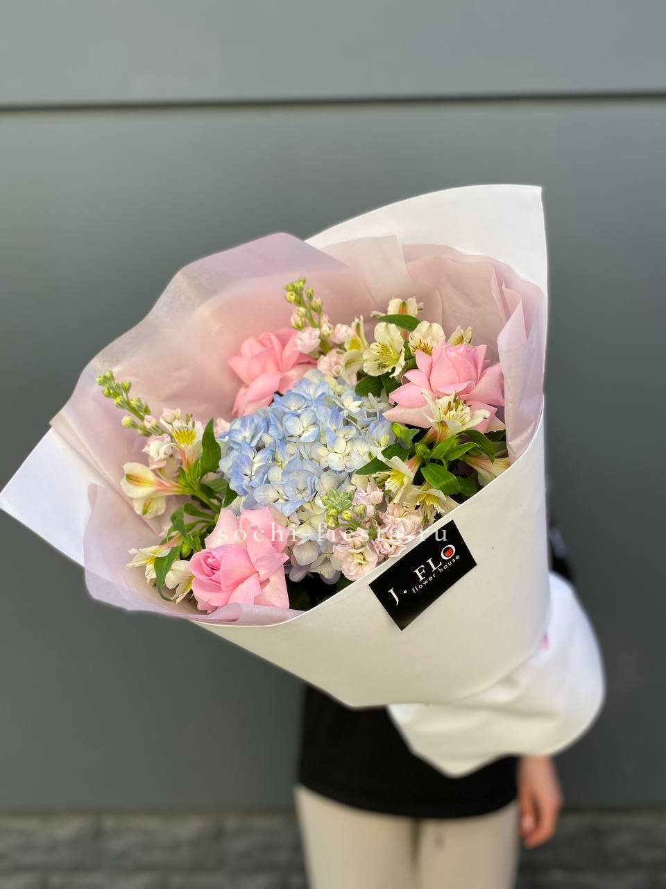 Пастельные оттенки гортензий переплетаются с белоснежными хризантемами, создавая воздушную дымку. Мягкие переходы тонов напоминают утренний туман над садом.