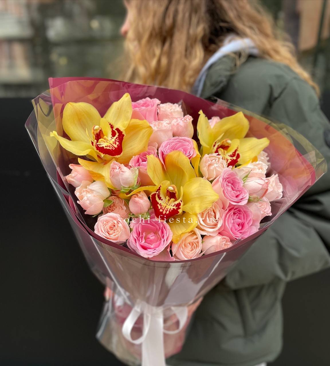 орхидея, роза, пионовидная роза бомбастик,  лента, дизайнерская пленка.