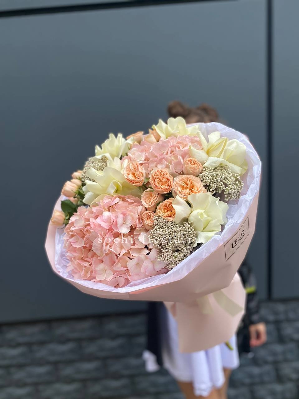 гортензия, пионовидная роза, озотамус, белая роза в нежном оформлении.