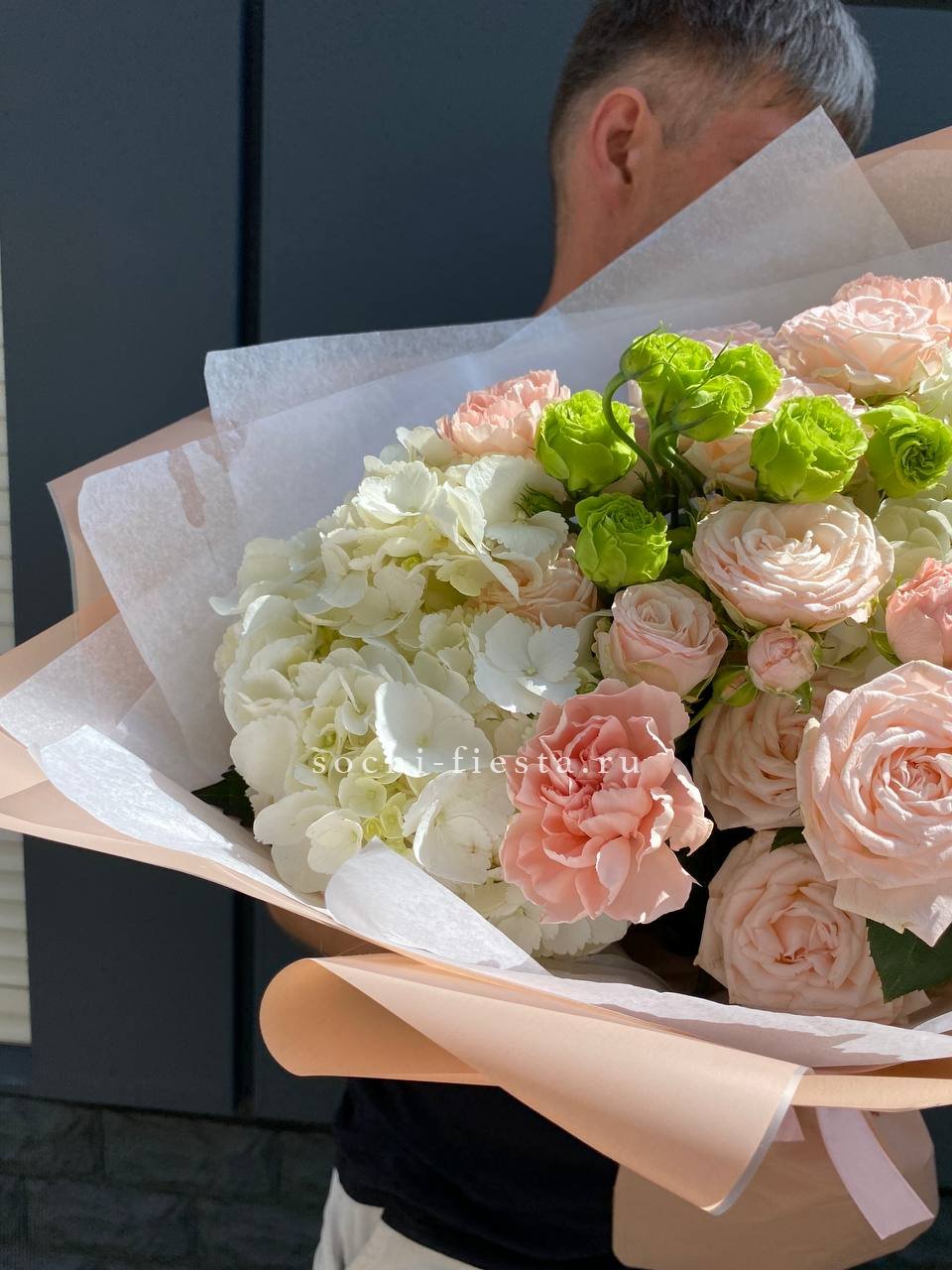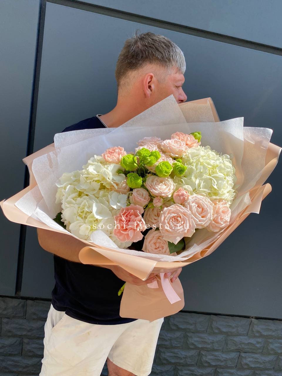 Плотная сборка с пышной гортензией в центре и рассыпчатыми соцветиями диантуса по краям. Эустома добавляет воздушности, а ветки озатамуса создают лёгкую графику. Букет держит форму и выглядит объёмно с любого ракурса.