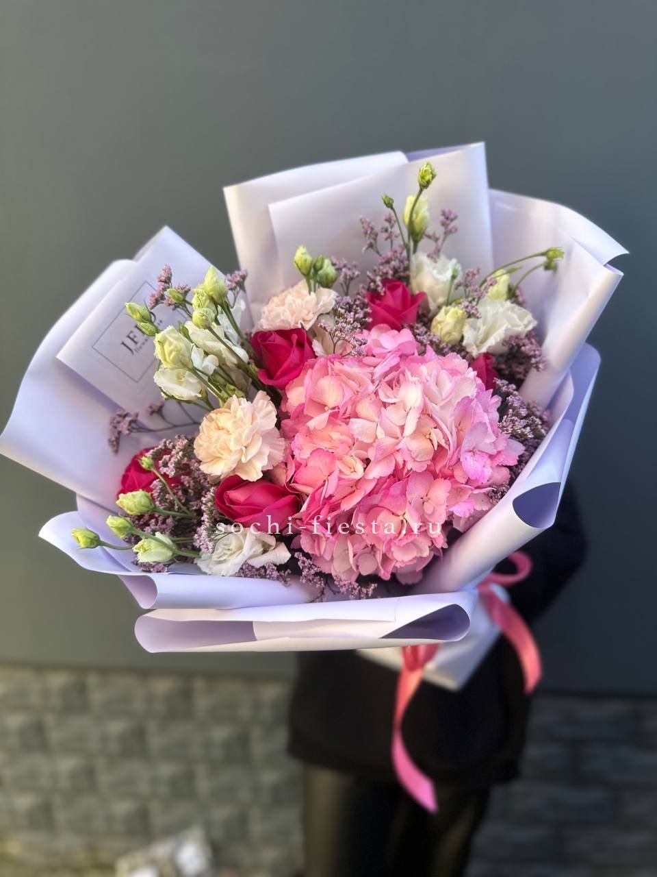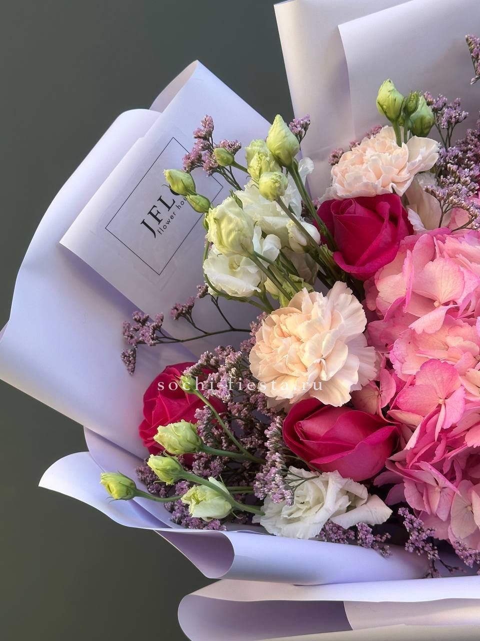 диантус, эустома, гортензия, хайди, эвкалипт, озатамус, пленка.
