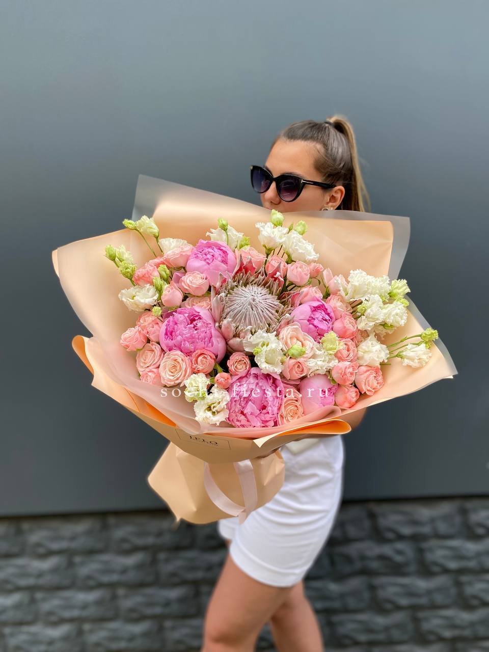 Пышные пионы окружены воздушными эустомами и миниатюрными кустовыми розами, а экзотичная протея добавляет композиции выразительный акцент. Бархатистые лепестки чередуются с полураскрытыми бутонами, создавая объёмную фактуру и глубину букета.