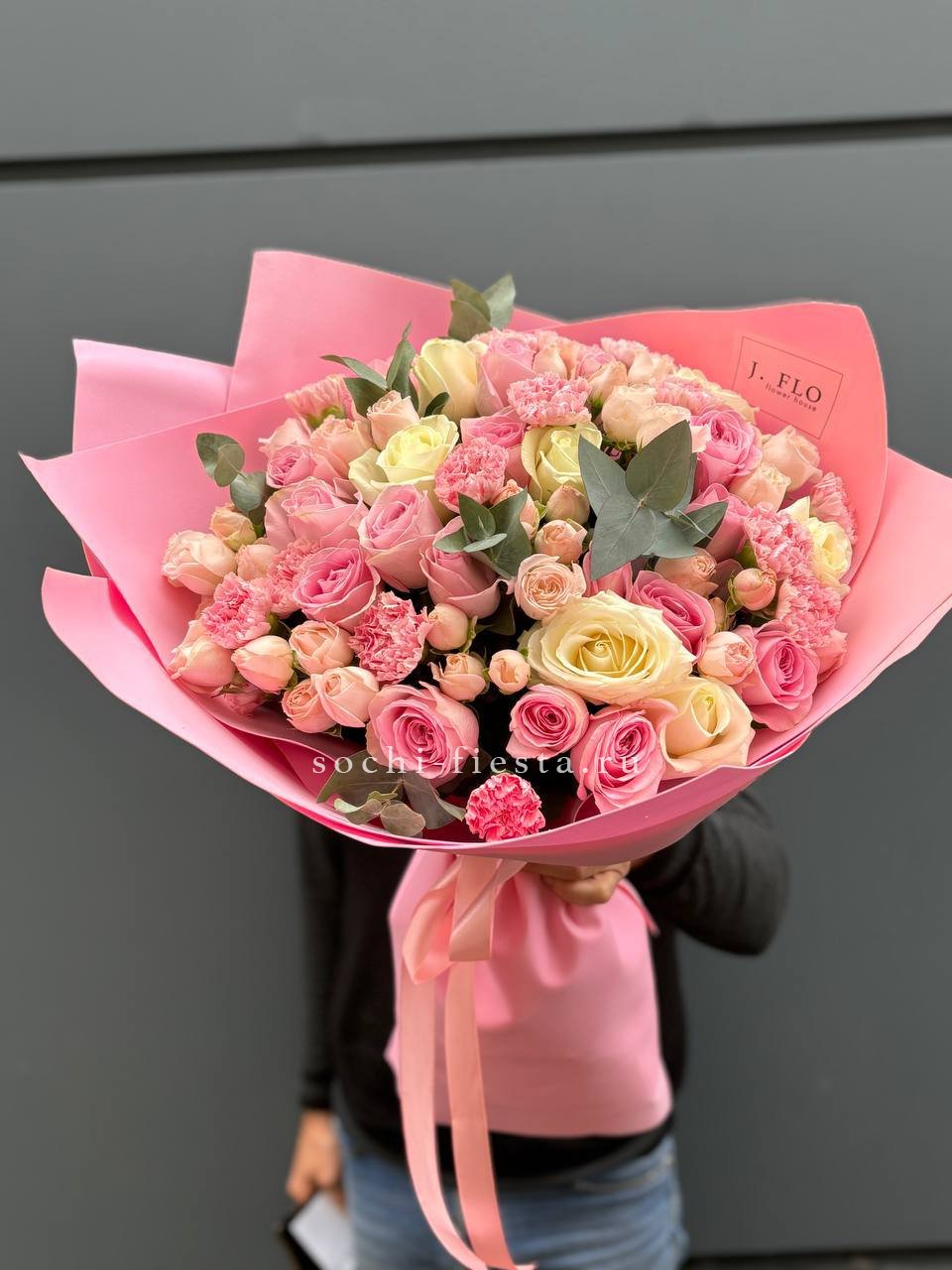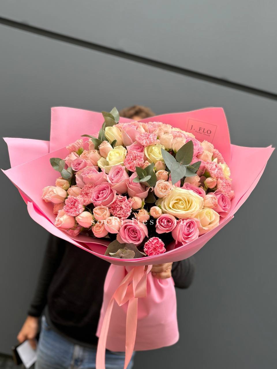 Диантусы и маттиола добавляют букету душистую лёгкость, а гортензия создаёт объёмную основу. Мисти баблс и эвкалипт рисуют воздушный контур вокруг розовых оттенков.