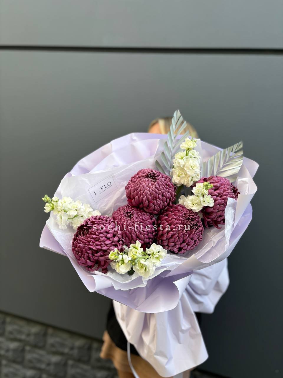 Графичные соцветия бигуди встречаются с воздушной маттиолой в неожиданном дуэте. Листья чики или эвкалипт расставляют акценты и создают глубину между яркими формами.