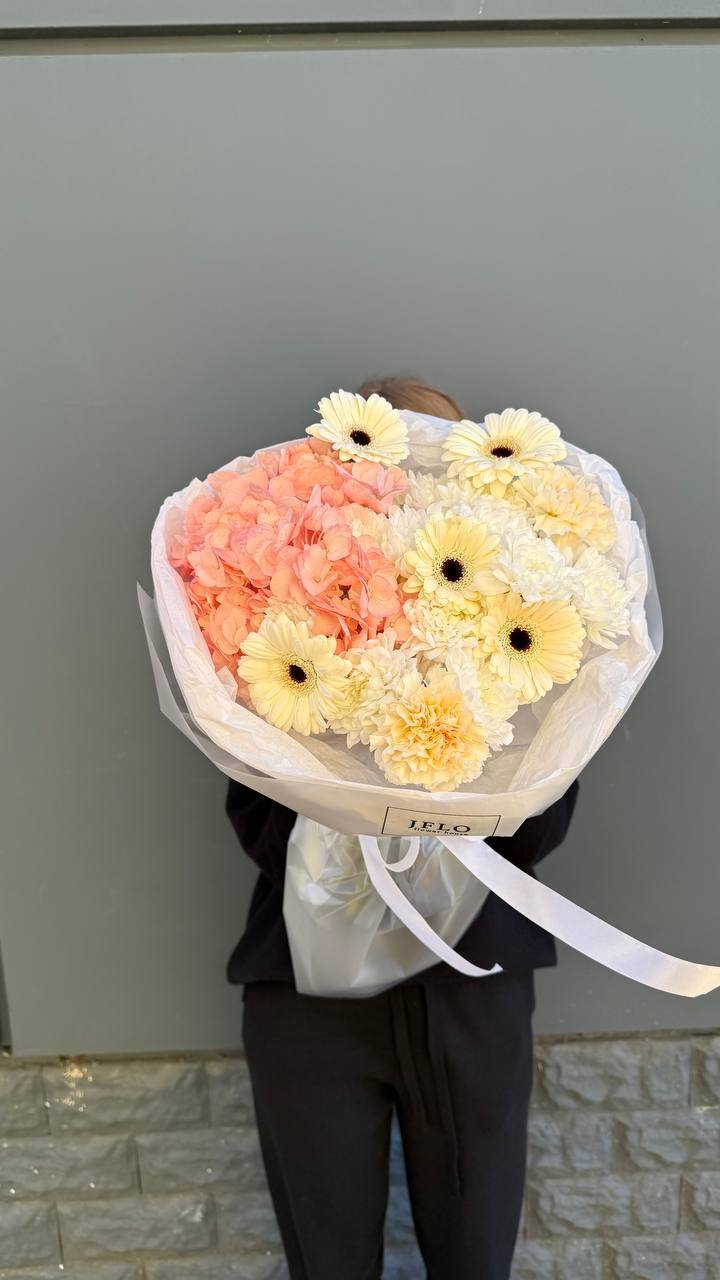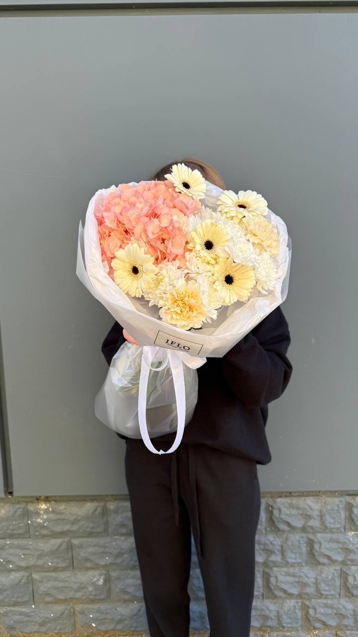 Воздушная композиция с белоснежной гортензией и пионовидными розами в окружении эвкалипта и пампасной травы. Светлая палитра и природная текстура создают ощущение летнего сада. Гармония форм и естественная свежесть в каждом элементе.