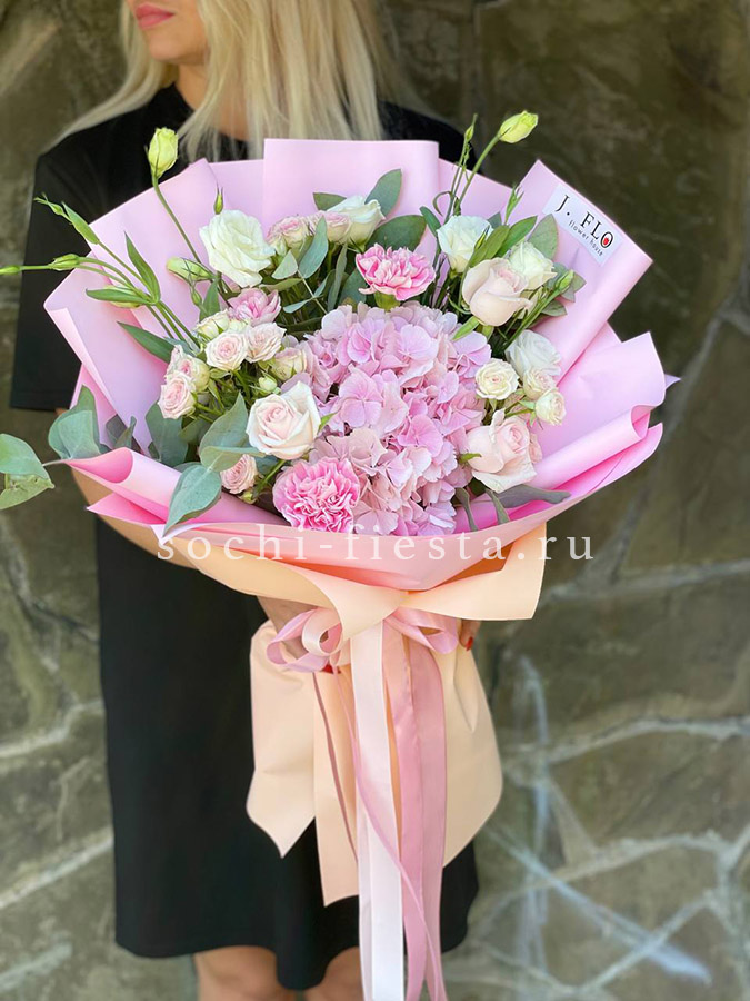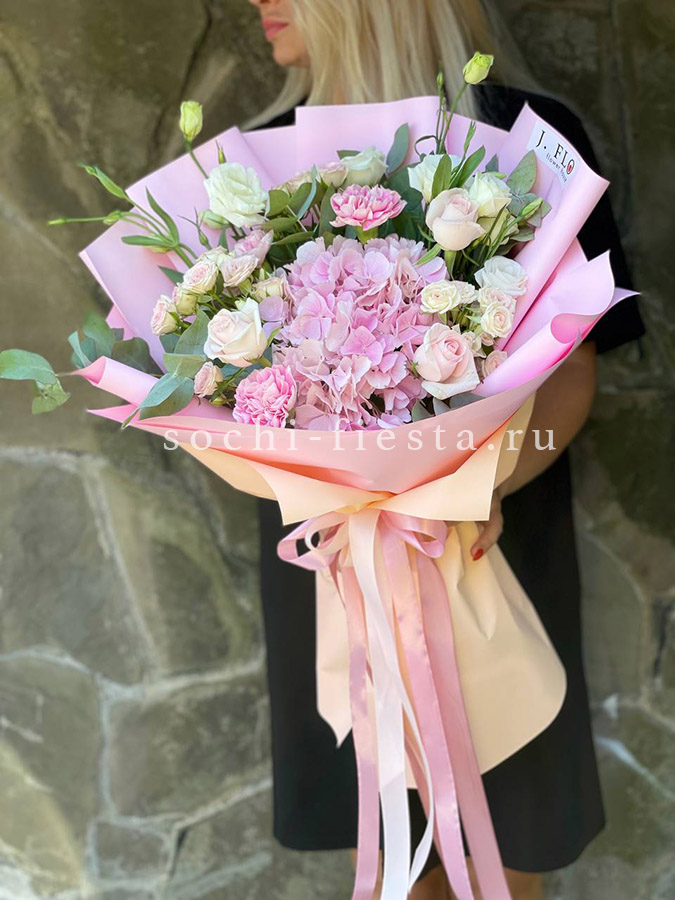 гортензия, пионовидные розы, эвкалипт, пампасная трава, лента, дизайнерская упаковка.