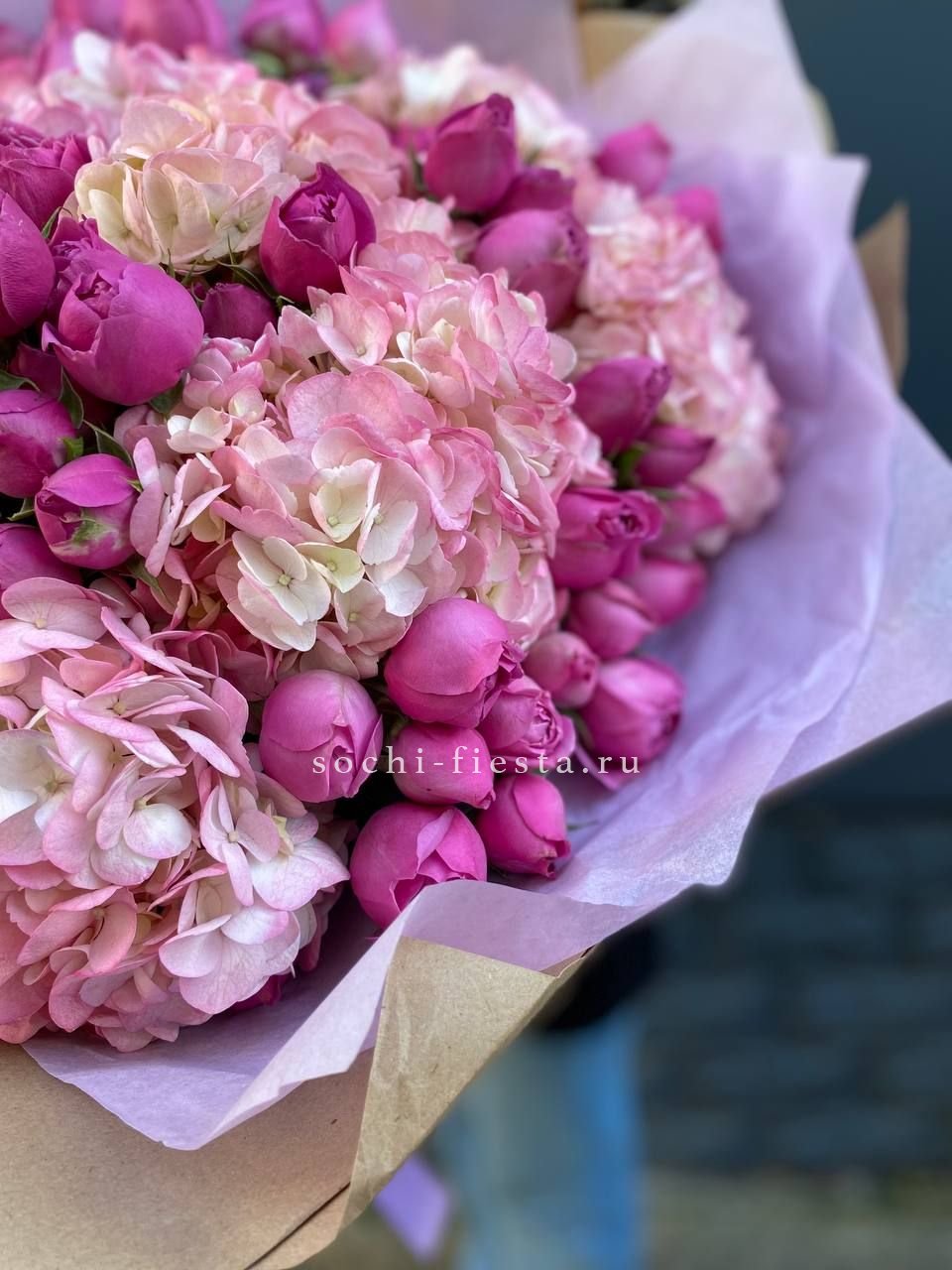 гортензия, пионовидная кустовая роза Мисти Баблс, лента, дизайнерская упаковка.