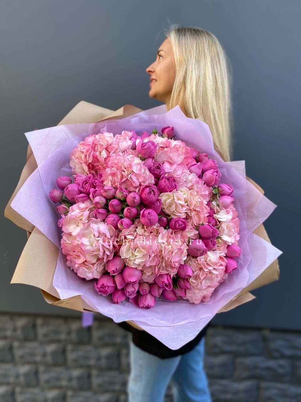 Масштабная композиция из гортензий и пионовидных кустовых роз Мисти Баблс впечатляет объёмом и присутствием. Такой букет заполняет пространство цветом и формой.