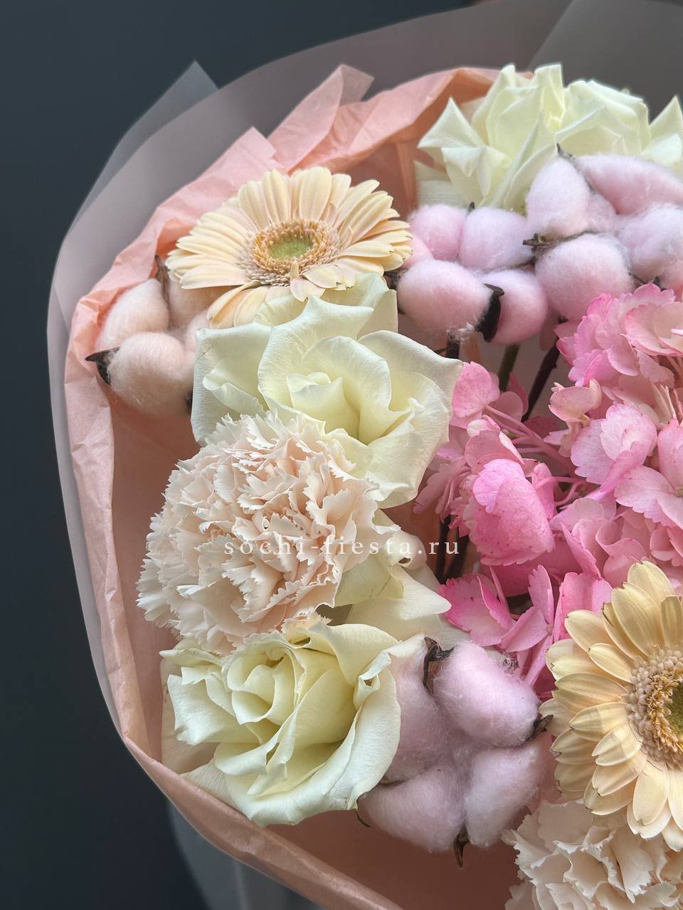 розовые розы, белые розы, диантус, бомбастик, гортензия, эвкалипт, пленка.