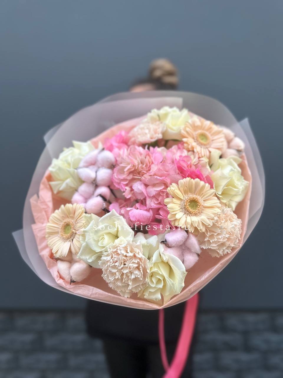 Пышная шапка из роз двух оттенков с объёмной гортензией и воздушным диантусом создаёт мягкий переход от белого к розовому. Бомбастик добавляет букету плотности, а эвкалипт освежает общую композицию. Универсальное решение для яркого поздравления.