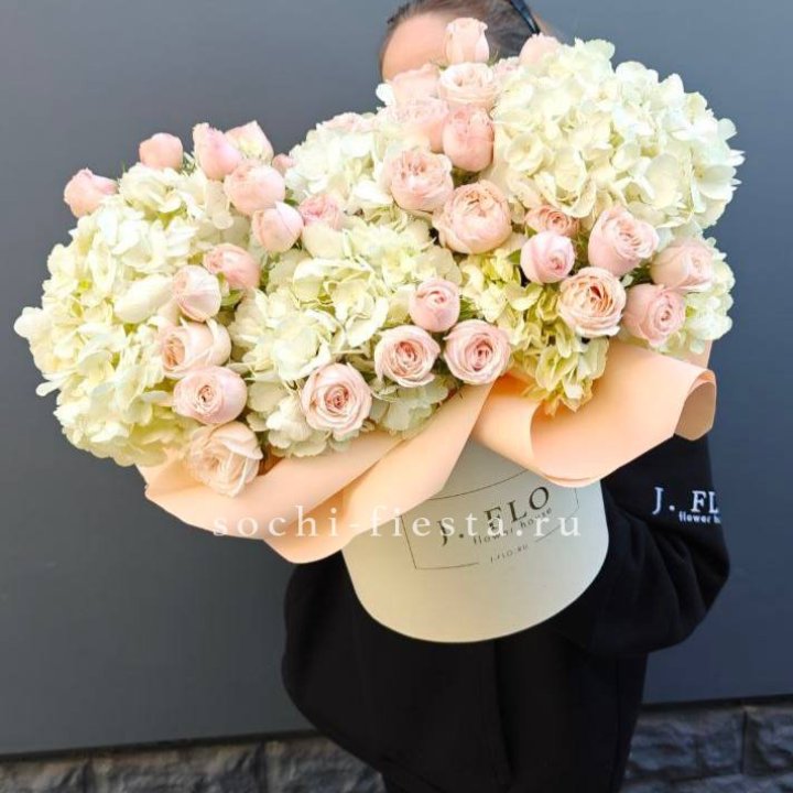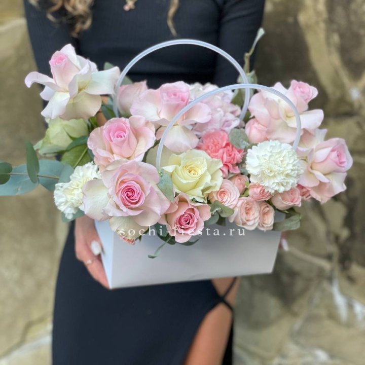 • Шляпная коробка с розами и гипсофилой — универсальный подарочный формат.