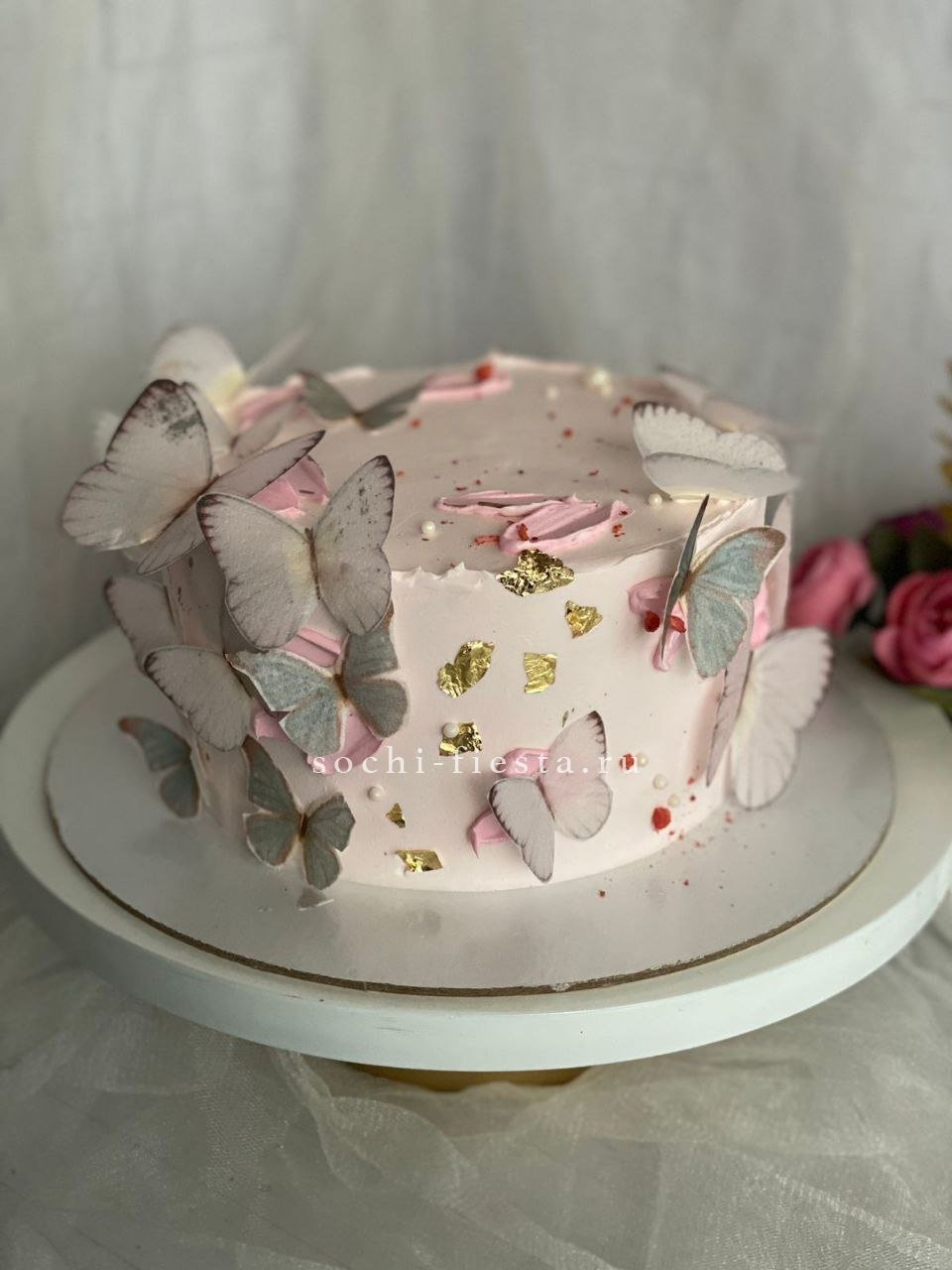 Светлая поверхность с мазками крема и декором в виде бабочек создаёт летнее настроение. Торт сочетает воздушность формы и плотность начинки на выбор из трёх вкусов.